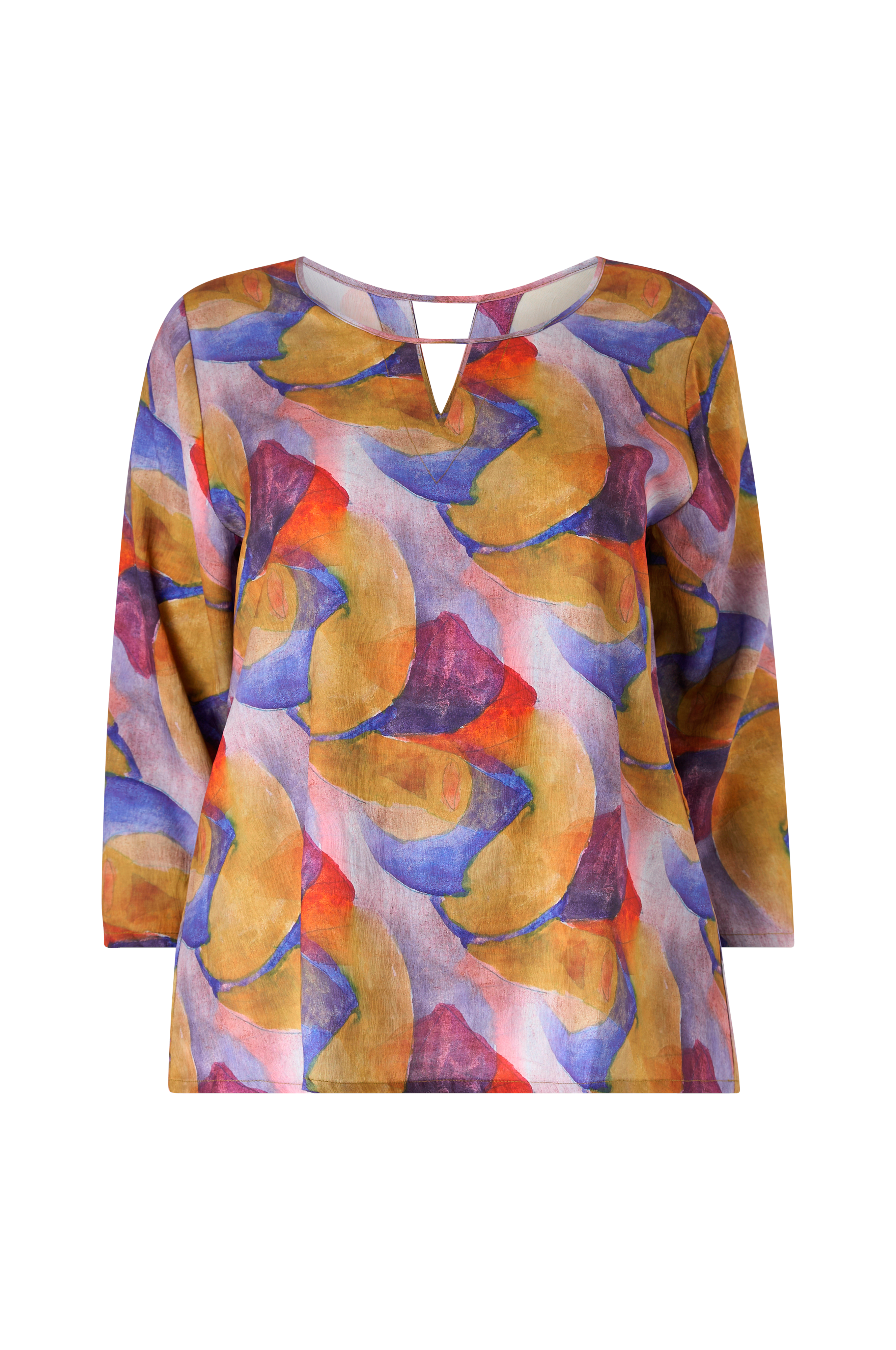 • Mønstret bluse med løs pasform• Rund halsudskæring med dekorativ, v-formet åbning foran• Nøglehulsåbning i nakken• 3/4 lange ærmer• Lidt længere, afrundet bagside• Plusstørrelser