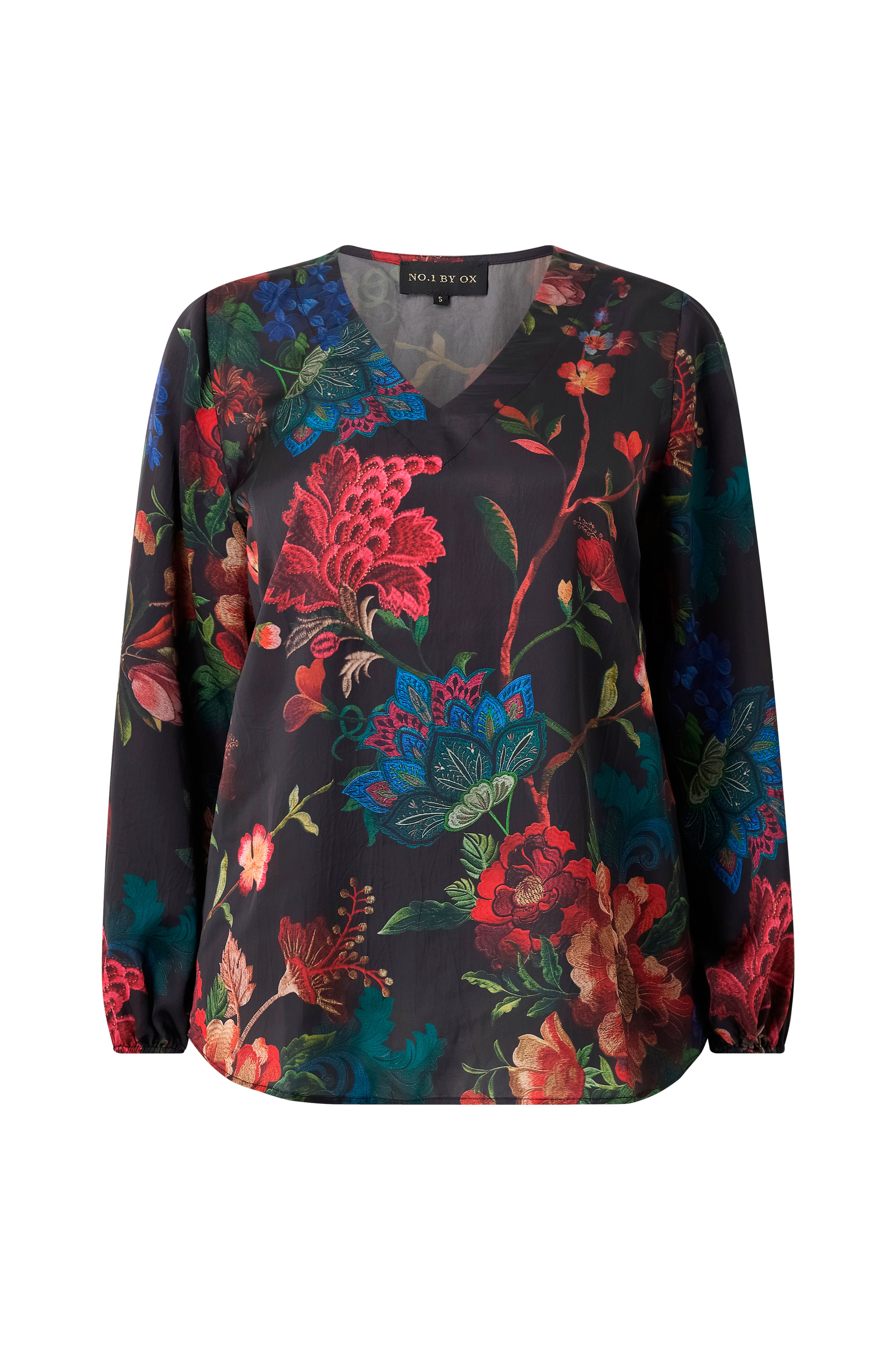 • Mønstret bluse i satin• V-udskæring• Lange ærmer• Elastik ved manchetterne• Plusstørrelser