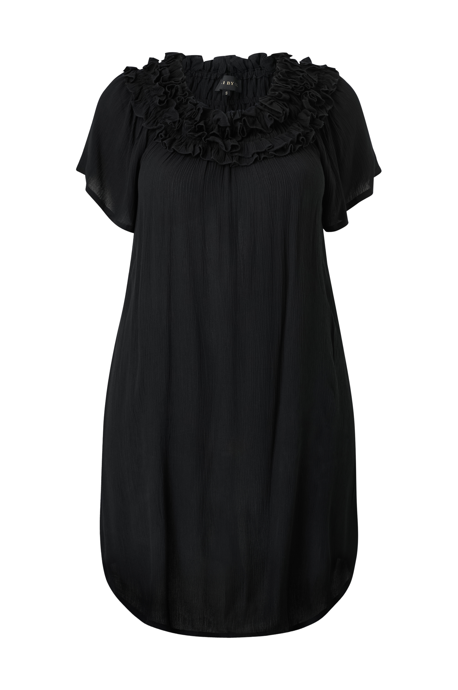 • Kjole i rynket viskose• Bred, elastisk halsudskæring med volanter• Korte ærmer• Længde: 97 cm i størrelse S• Plusstørrelser