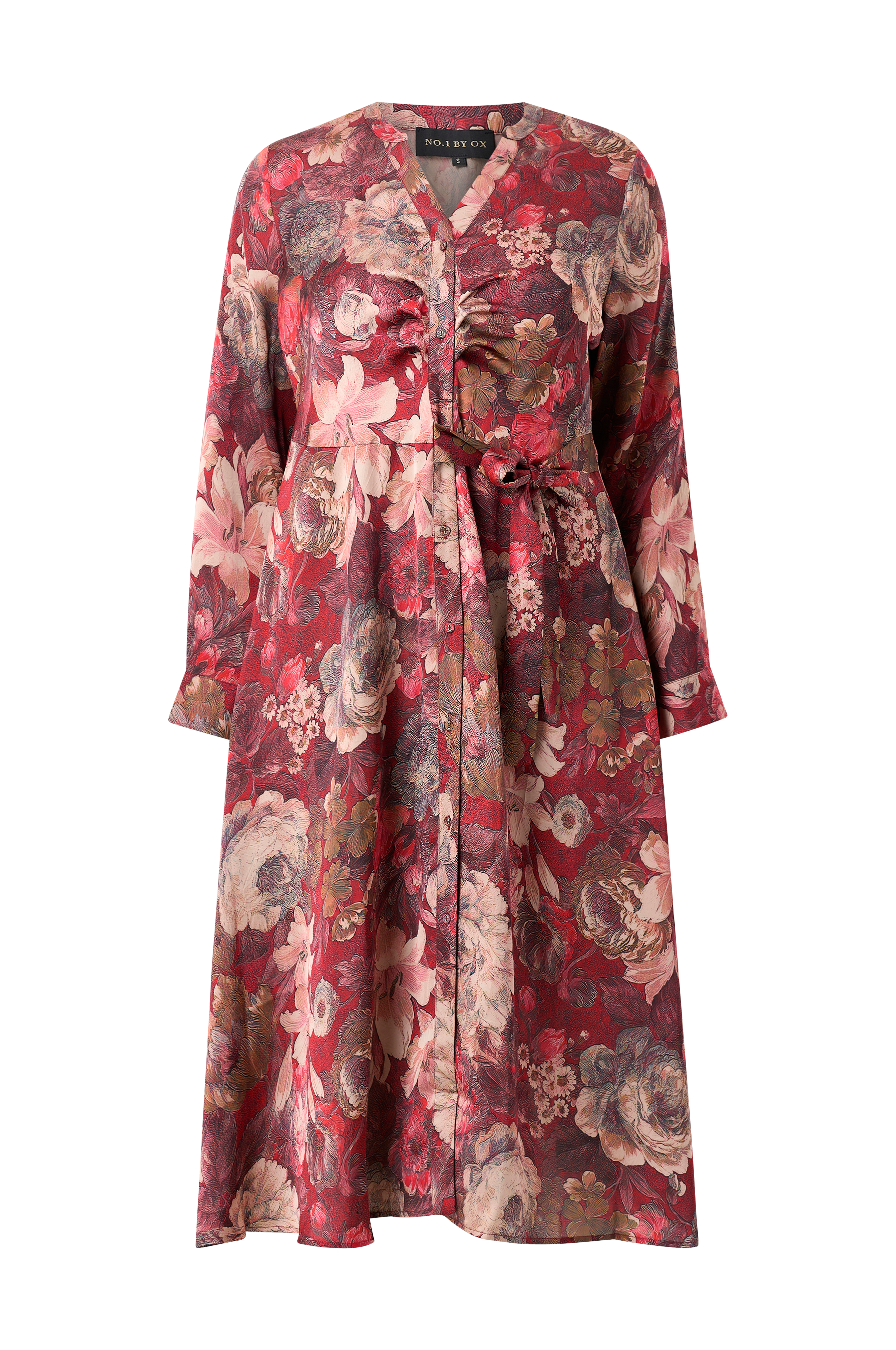 • Mønstret kjole i satin• V-udskæring• Lange ærmer• Manchetter ved manchetterne• Knaplukning• Bølgeformede detaljer• Bindebånd ved taljen• Plusstørrelser• Længde: 125 cm i størrelse S