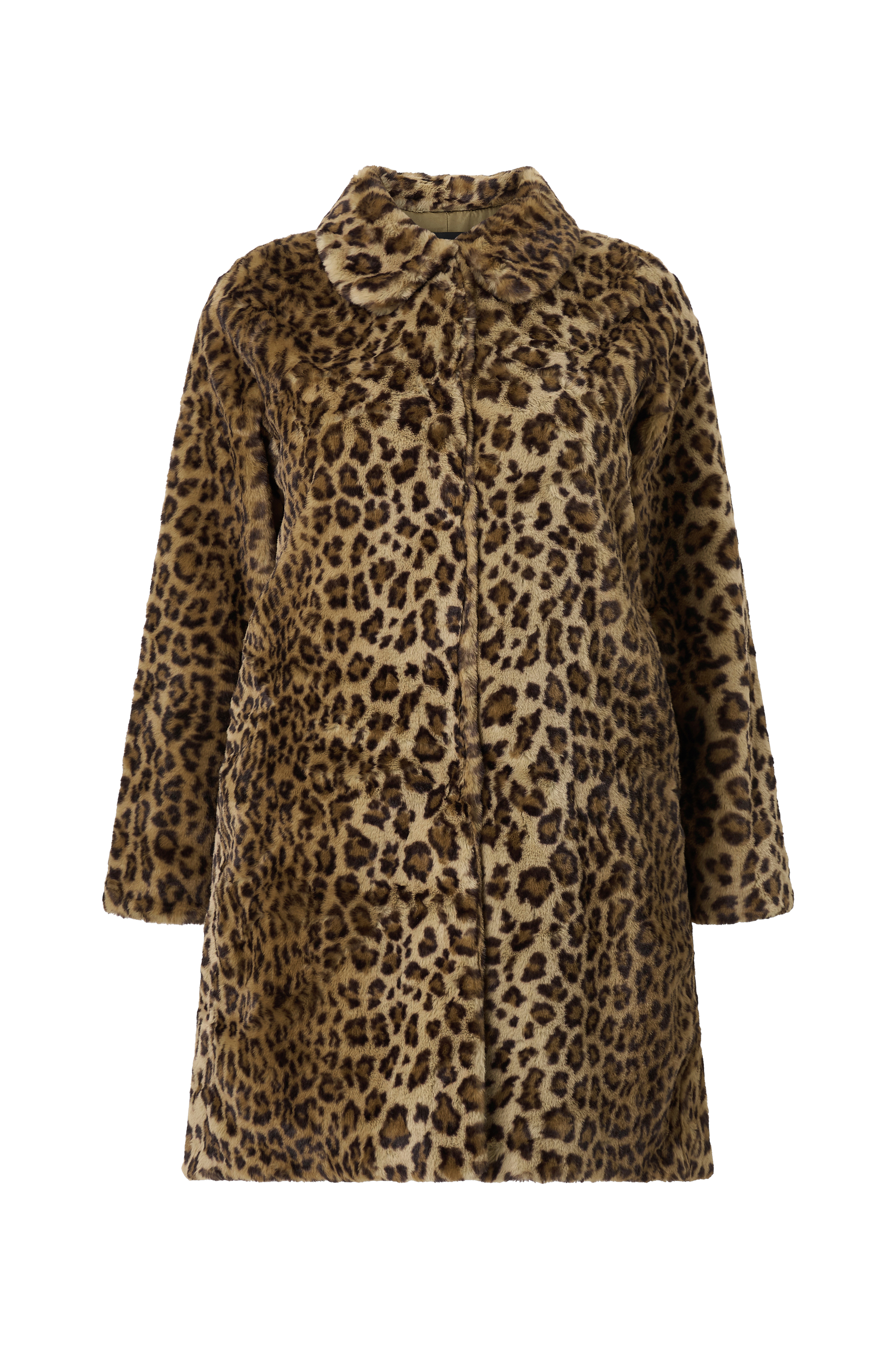 • Lang, leopardmønstret frakke i kunstskind• Høj krave• Skjulte trykknapper foran• Tyndt, vævet inderfor• Skjulte sidelommer• Plusstørrelser