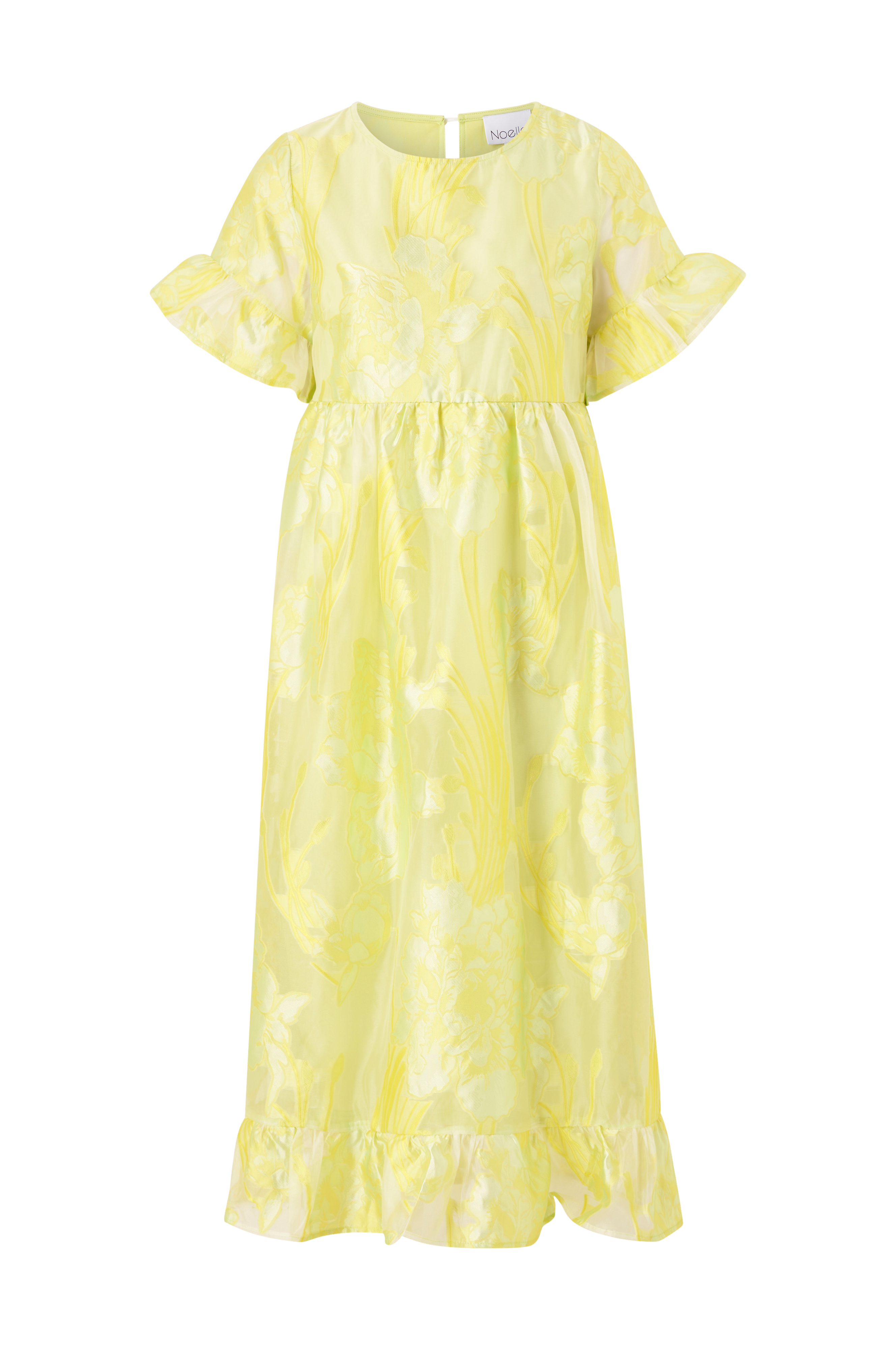 • Fremstillet af semitransparent organzastof med jacquardvævet blomstermønster • Vævet, uigennemsigtigt for • Løs pasform • Rund hals • Slids med perleknap i nakken • Korte ærmer med volant ved manchetterne • Volant ved nederste kant • Længde: 121 cm i størrelse S