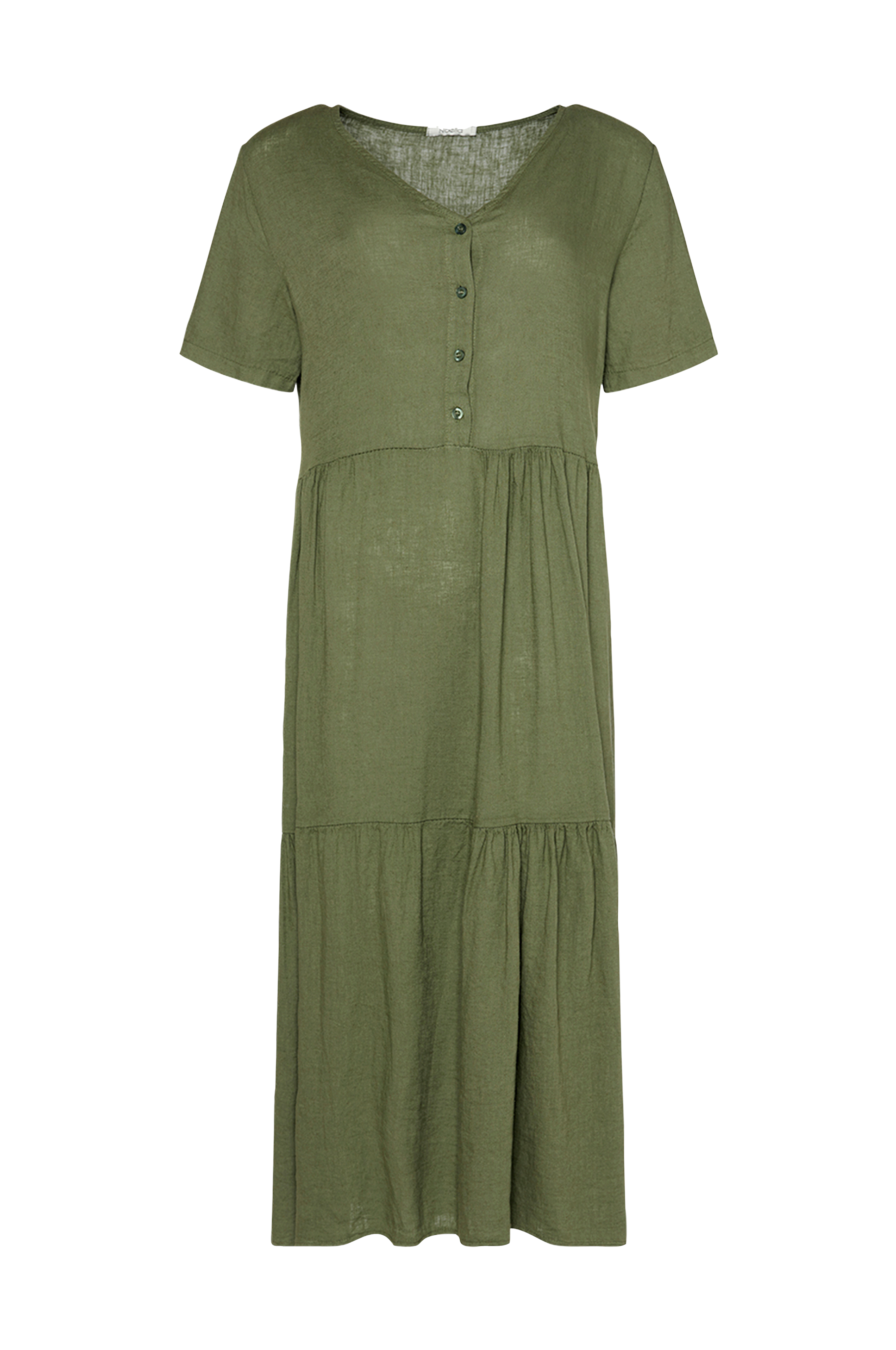 Kjole i en blanding af hør og viskose. En skøn, løs sommerkjole med kort ærme, v-udskæring og knapper ned til taljen. Længde ca. 121 cm i str. S.