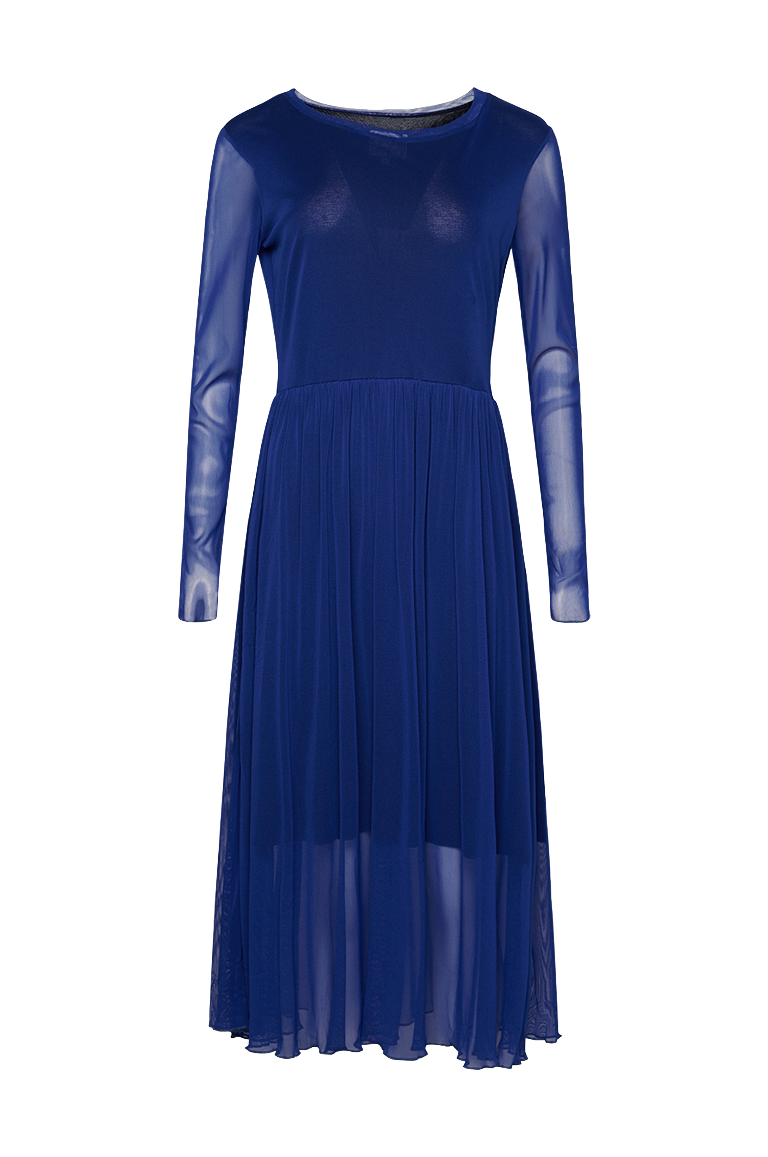 Foret kjole i mesh med lange, uforede ærmer. Rund hals. Elastisk afskæring i taljen. For og underskørt i stretchjersey. Længde ca. 116 cm i str. S.