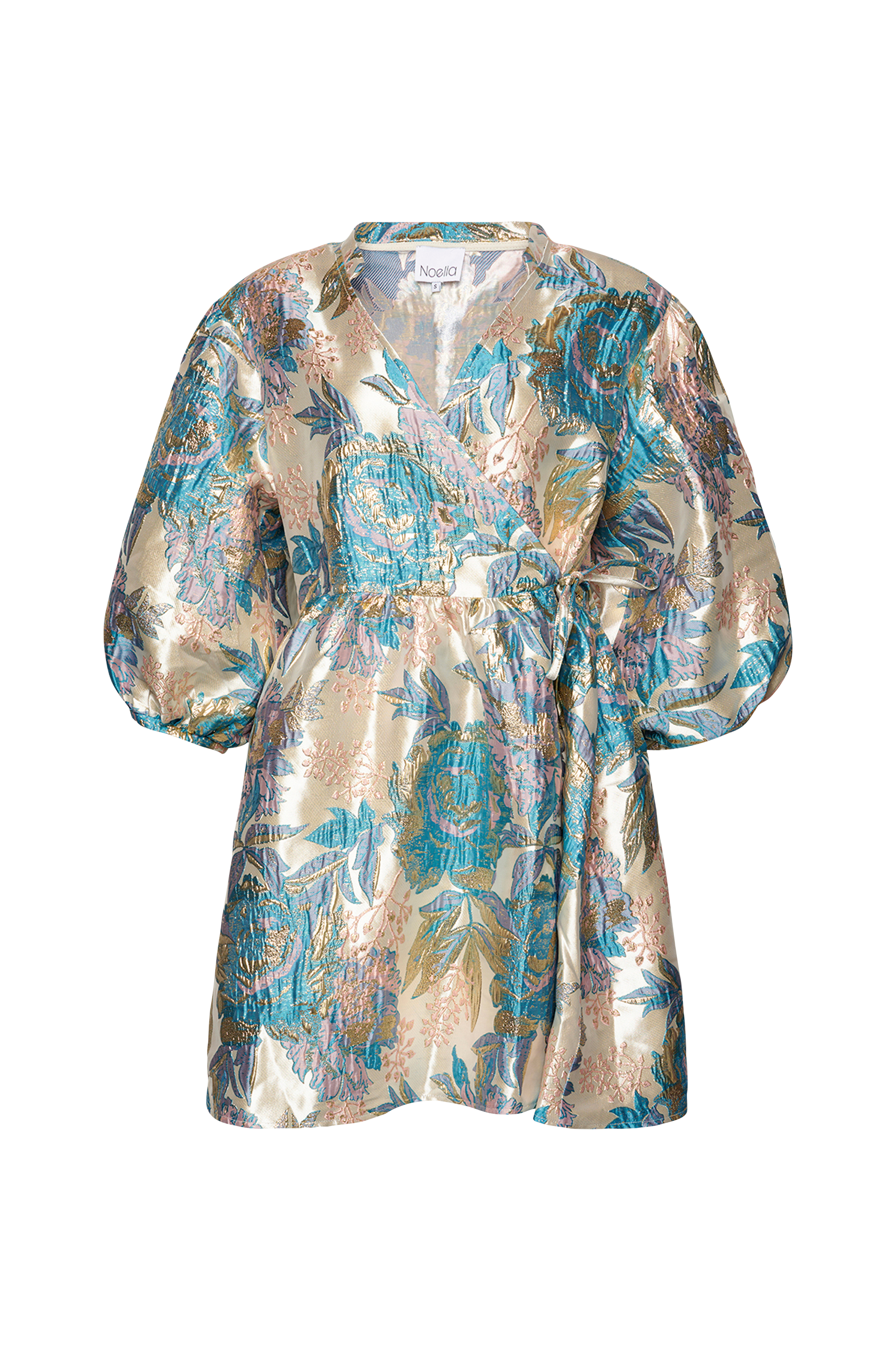 • Jacquardvævet kjole med guldfarvede detaljer hele vejen rundt • Åben overpaningsmodel med bindebånd ved taljen • Ballonærme med 3/4 længde • Længde: 88 cm i størrelse S