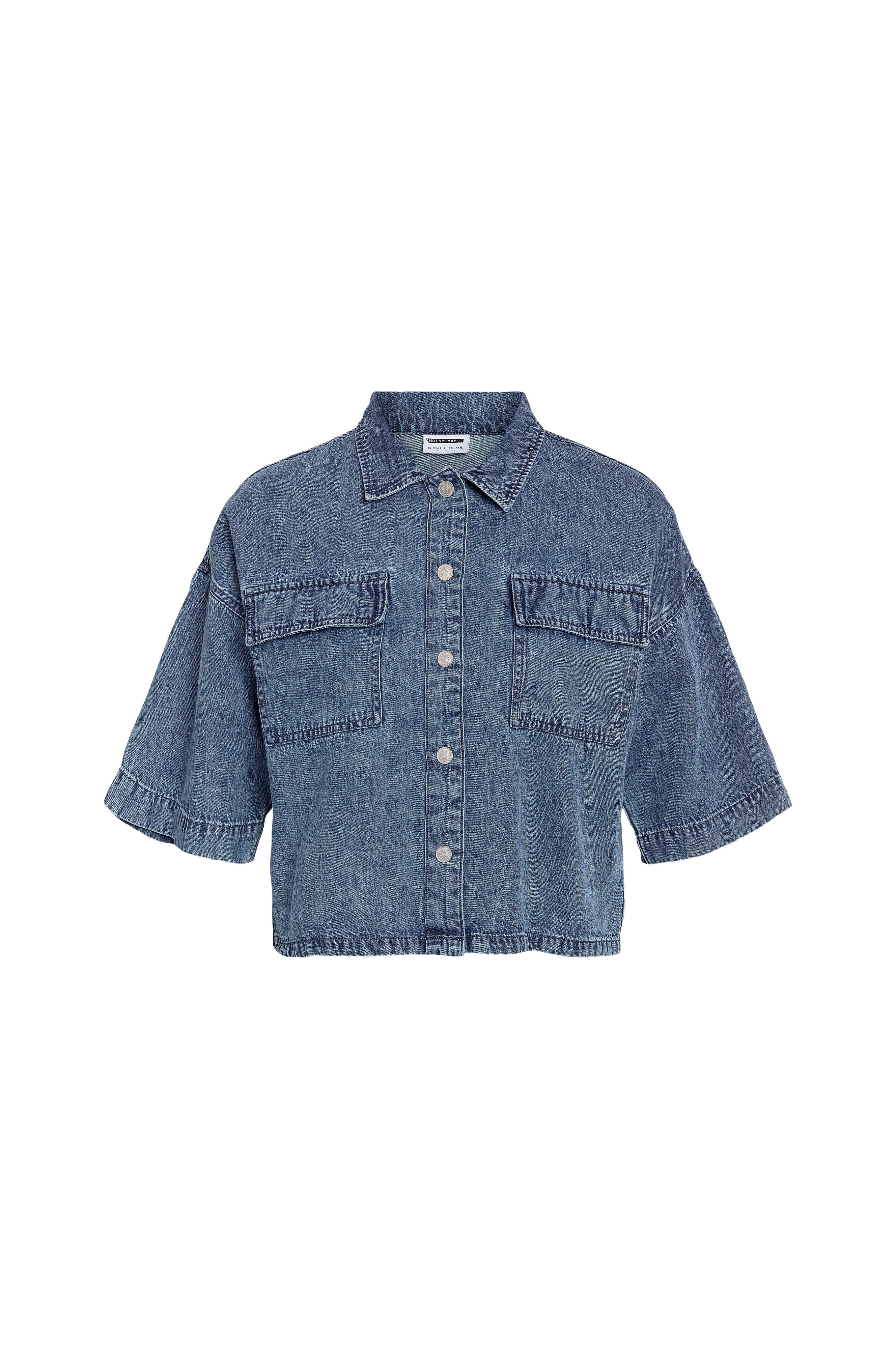 • Kortærmet skjorte i bomuldsdenim• Klassisk skjortekrave• Lukning foran• Forlommer med låg• Croppet design• Plusstørrelser