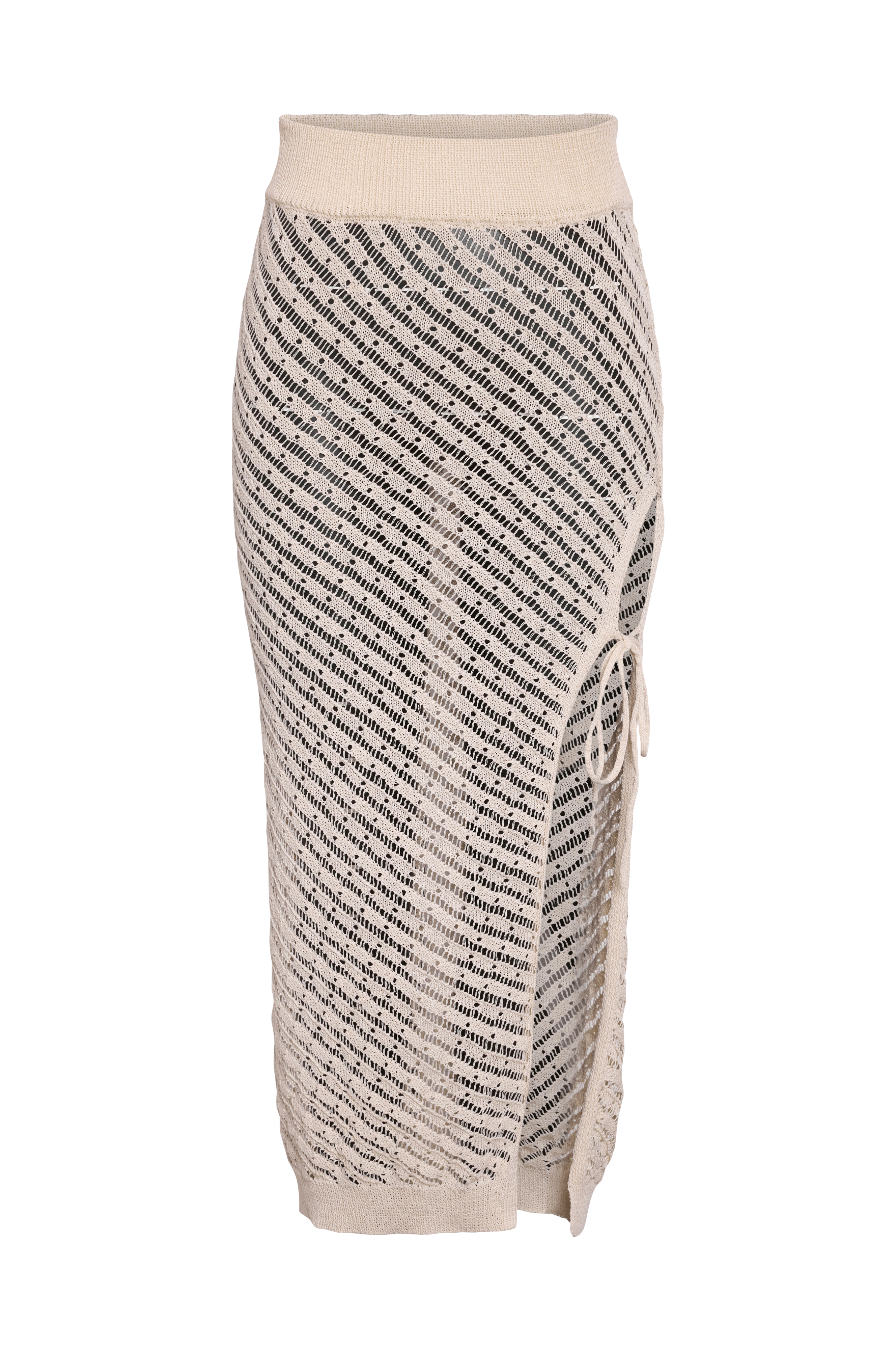 • Store størrelser• Lang, mønsterstrikket model• Bred, ribstrikket linning med indvendig elastik• Høj slids med bindebånd i den ene side• Længde: 97 cm i størrelse 44