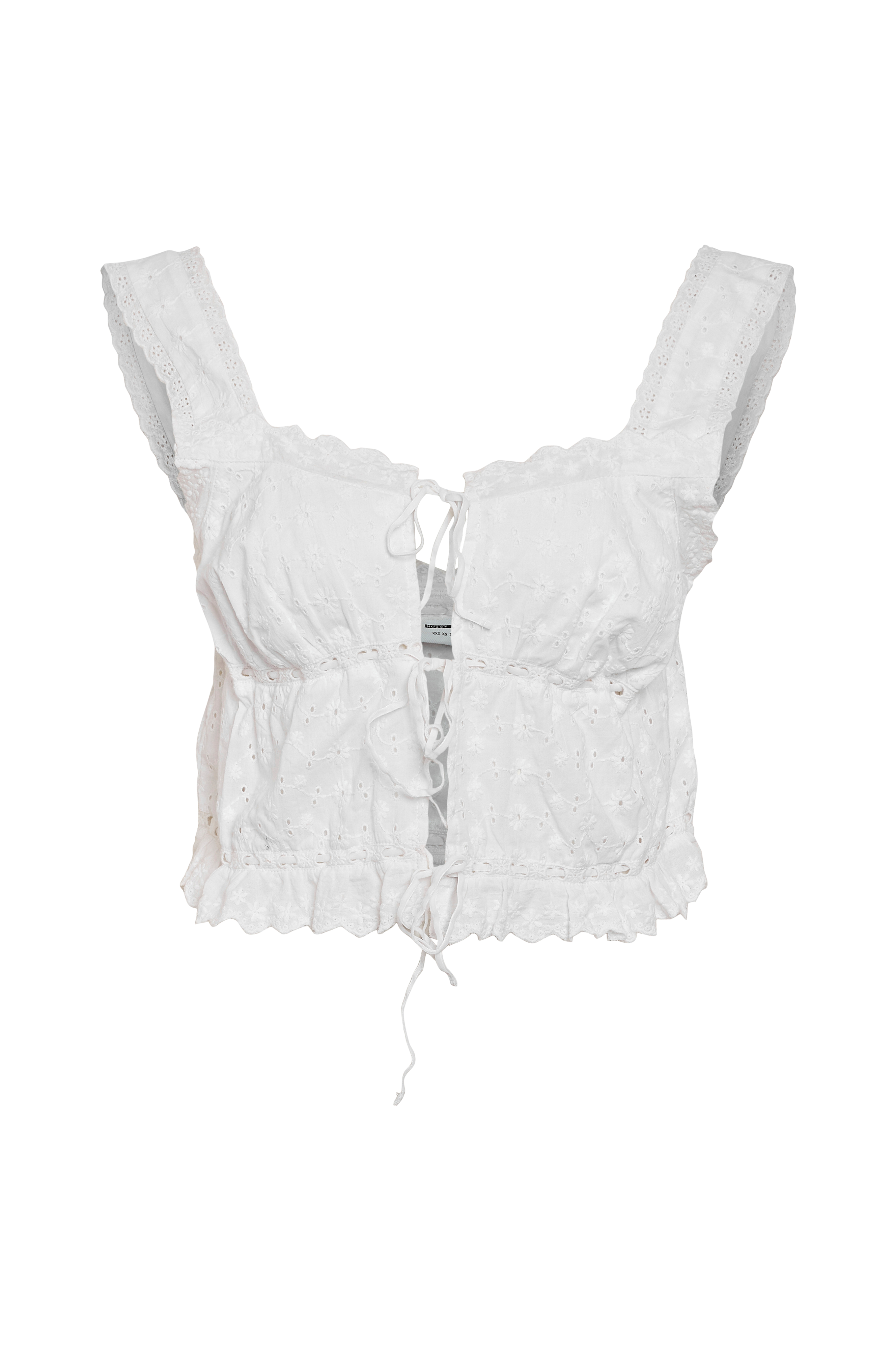 • Kort, ærmeløs top med hulbroderier overalt• Brede skulderstropper• Hjerteformet udskæring• Knudedetaljer foran• For ved brystet