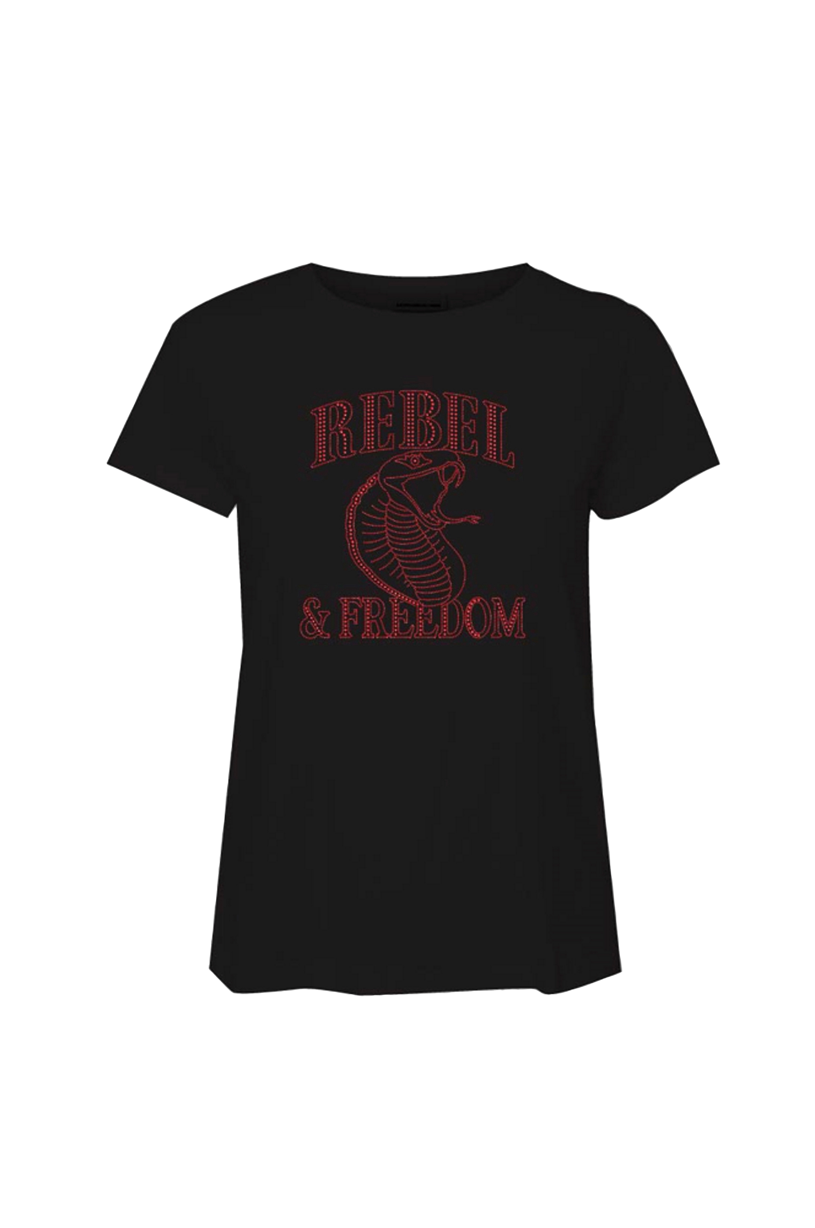 • Rund halsudskæring• Kort ærme• Motiv med glitrende, farvede sten foran