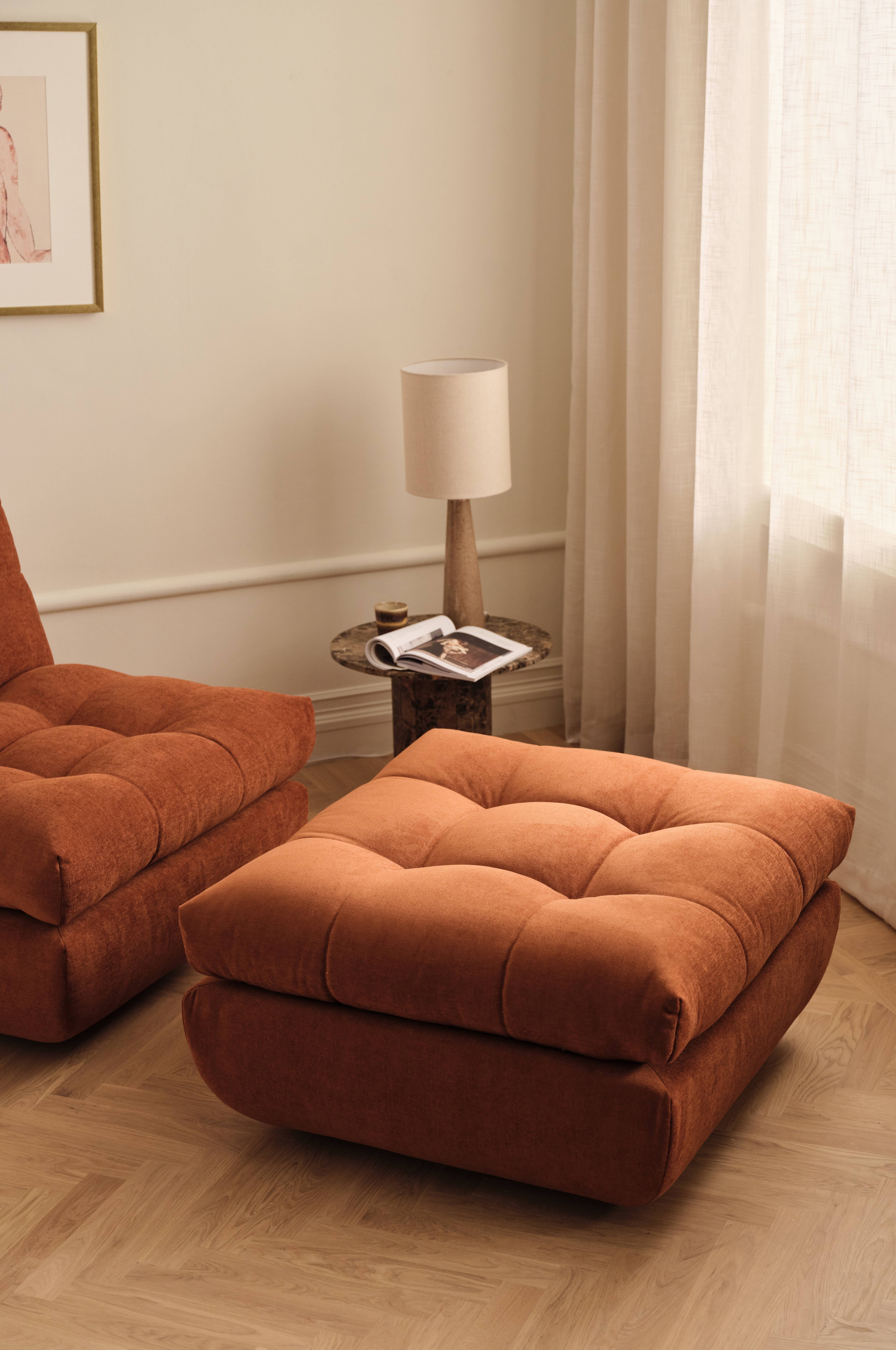 Denne puf er en perfekt balance mellem form og funktion. Kombinerer god komfort med et elegant look. Rammen er med nozag-fjedre. • Skelet i Bøg • Ben i egetræ • Fyld i polyetherskum