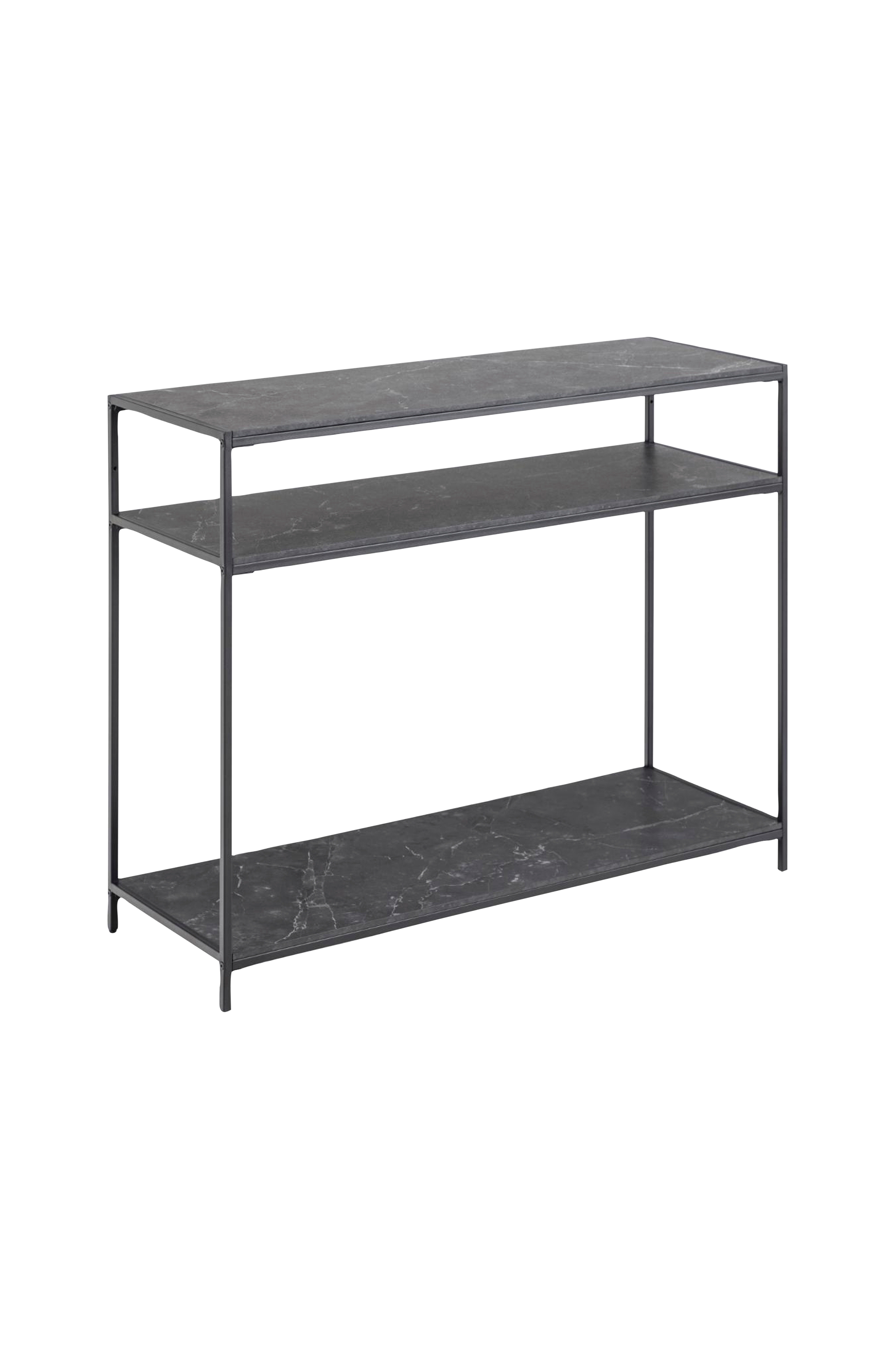 Giv din bolig et industrielt udtryk med dette konsolbord. De rene linjer, marmorstilen og det sorte, pulverlakerede metal gør, at konsolbordet passer ind i entreen, dagligstuen eller til og med soveværelset. Tilføj lidt varme med blomster, stearinlys eller dine yndlingsting, eller brug det som praktisk opbevaringsmøbel. Bordplader af folieret MDF.