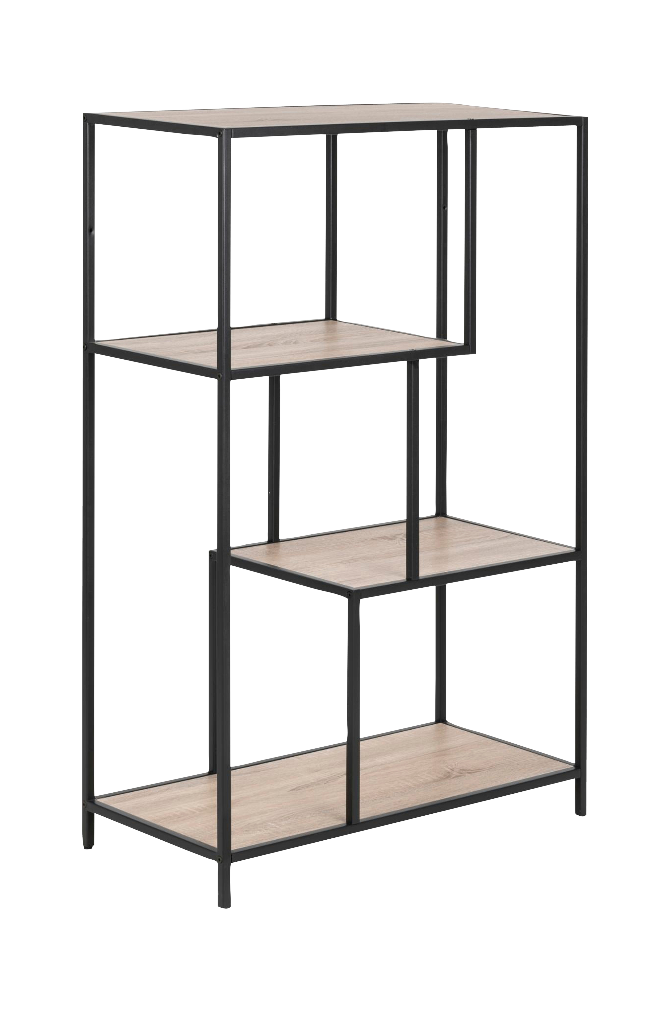 Denne reol er designet med små fine detaljer og gør en stor forskel i dit hjem. De to rustikke, men elegante hylder med Sonoma eg-finish holdes op af en rustik sort metalramme, hvilket skaber en forfriskende kontrast. For at fremhæve hver enkelt pyntgenstand er hylderne asymmetrisk placeret, hvilket yderligere forstærker det visuelle indtryk. Det er et moderne designmøbel, der giver indretningen dybde, på en naturlig måde. MDF med egefolie.
