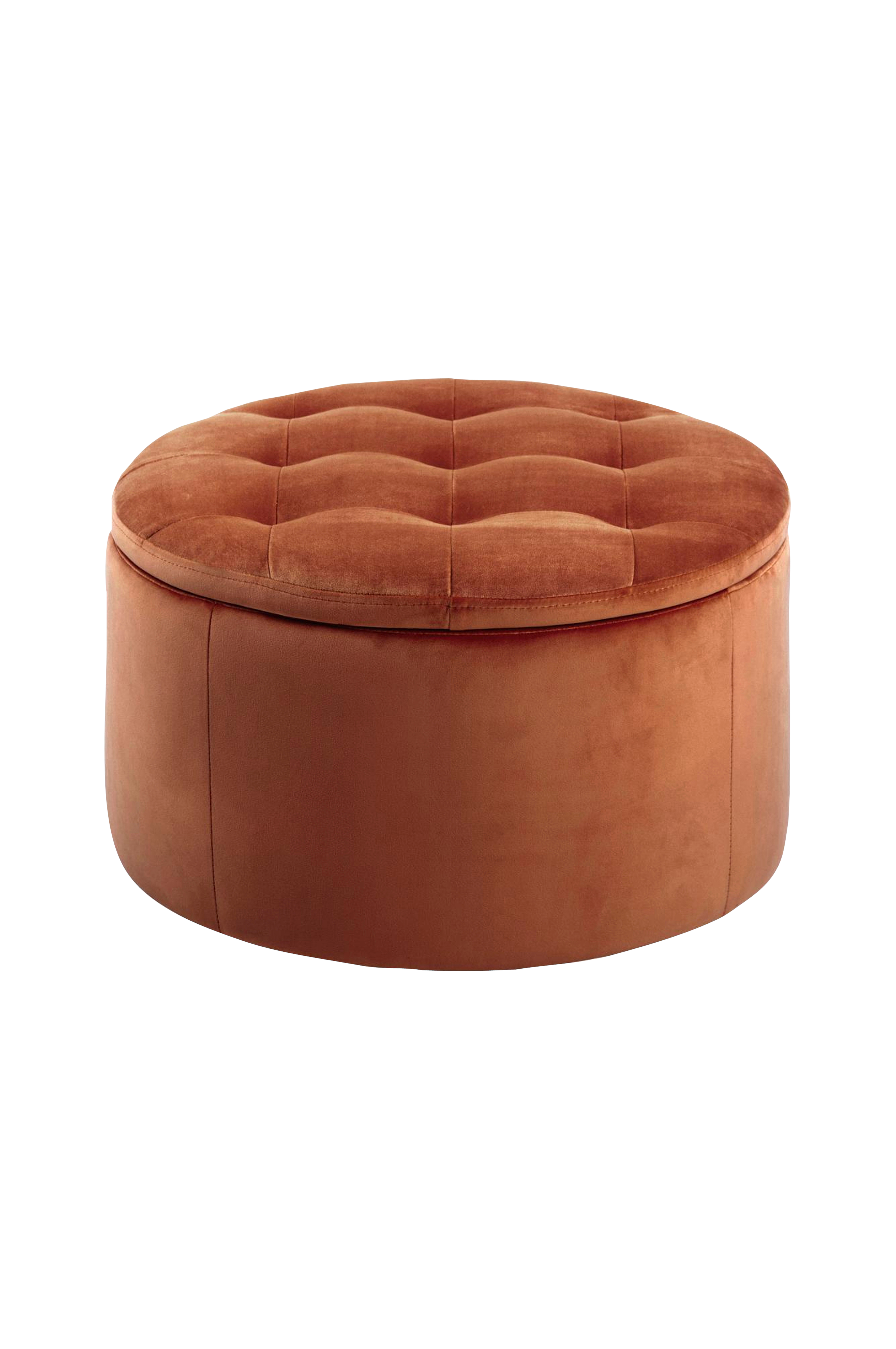 Siddepuf med opbevaring og polstret sæde. Ramme af MDF, plywood og massivt træ. Diameter 60, højde 35 cm. Betræk af 100 % polyestervelour. Martindale 25.000. Leveres samlet.