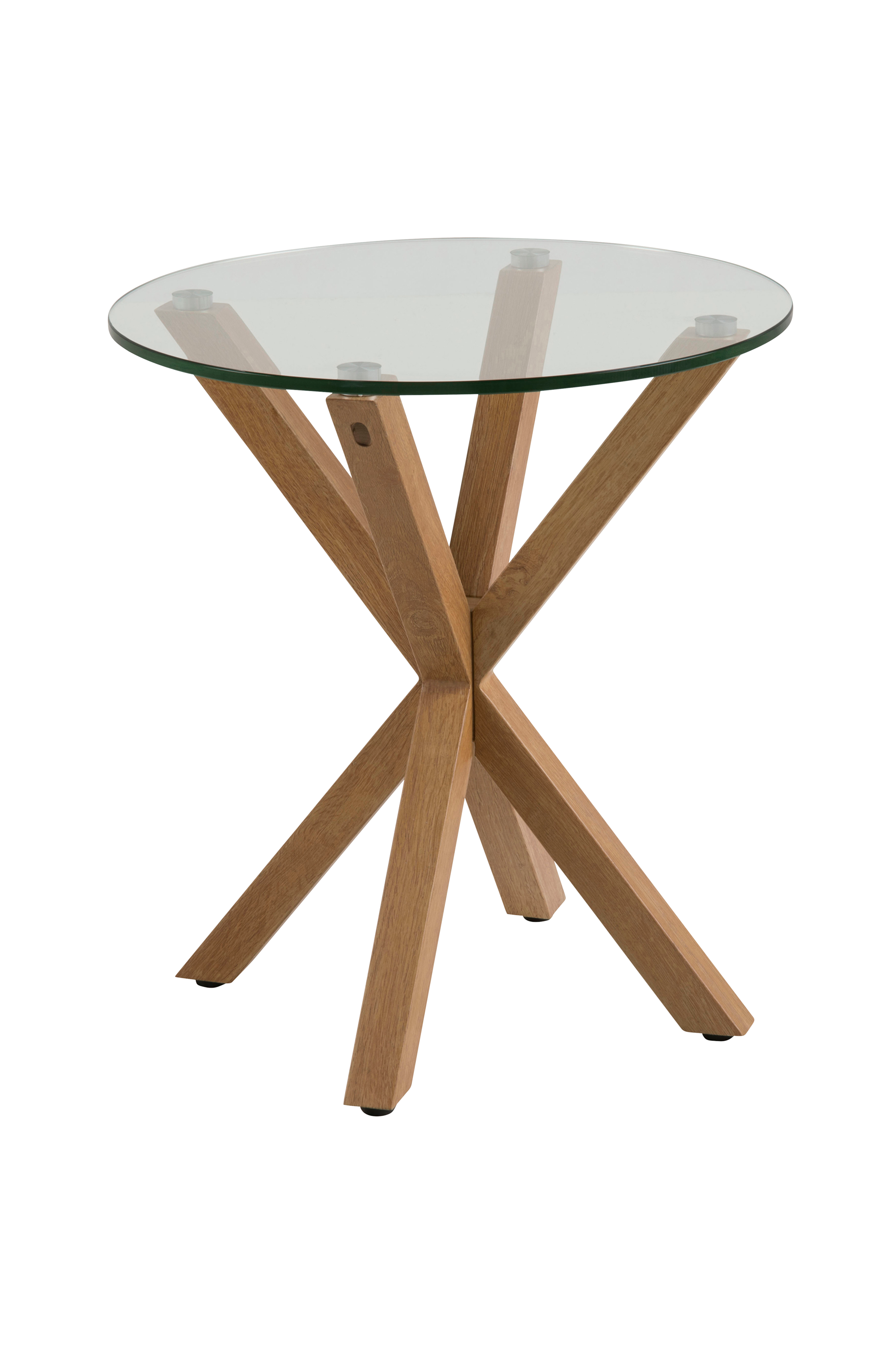 Sidebord Milou med bordplade af 10 mm klart glas. Egefolierede metalben. Diameter 50 cm, højde 55 cm. Leveres usamlet.