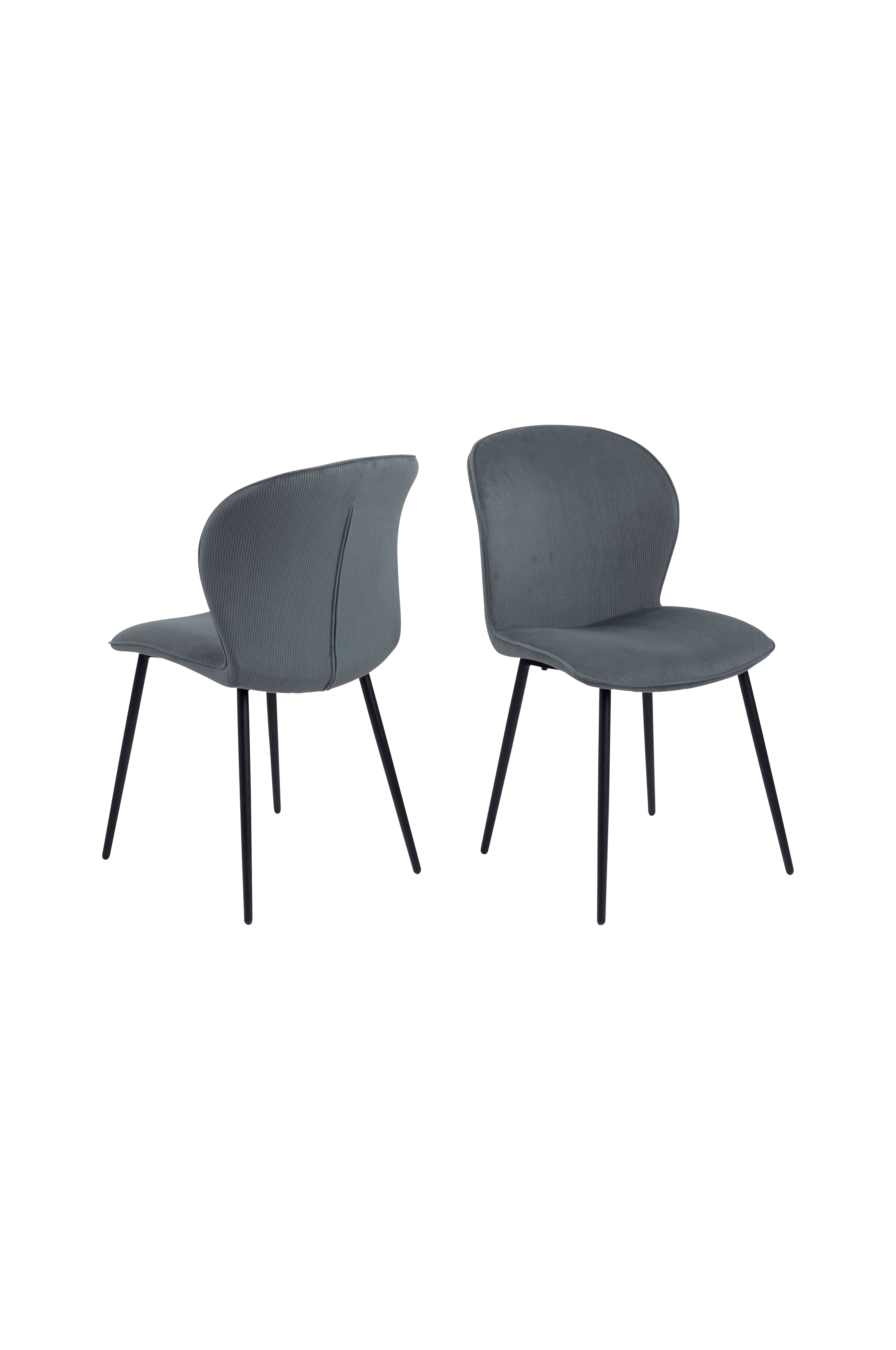 Spisebordsstol Evy leveres i 2-pak. Sæde betrukket med 100% polyesterstof, fløjl. Ben af pulverlakeret metal. Højde 82 cm, dybde 58.5 cm, bredde 43 cm. Siddehøjde 46,5 cm. Leveres usamlet.