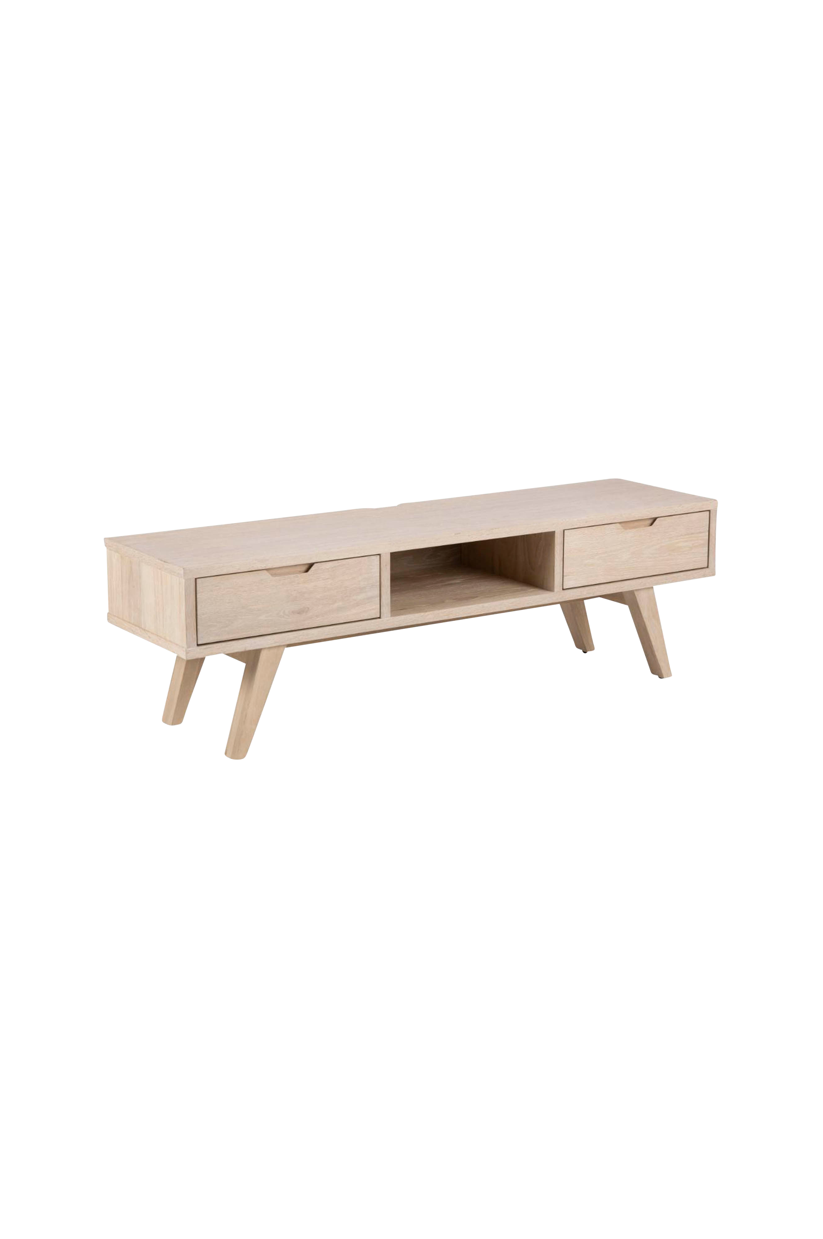 Denne tv-møbel er en moderne version af klassisk skandinavisk design. Den smalle profil giver møblet et let og moderne udtryk. Møblet har godt med plads til opbevaring med to skuffer og et åbent rum - og bemærk de integrerede håndtag. Lad den stå centralt i dit hjem.