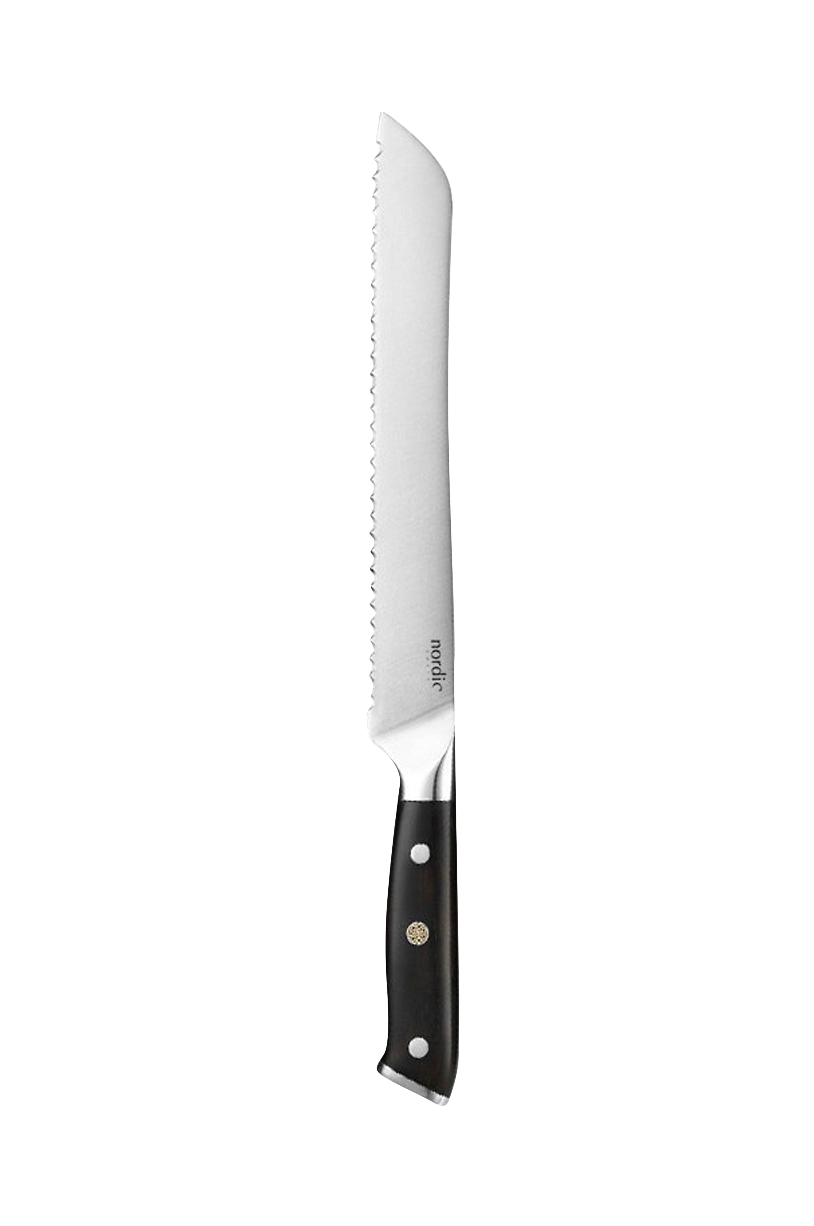 Nordic Chefs brødkniv bruges primært til at skære brød, men er også meget velegnet til tomater eller hvis du skal hakke noget chokolade. Det takkede blad gør den nem at bruge med minimal kraft. Kollektionen fra Nordic Chefs er fremstillet af tysk 1.4116 rustfrit stål med ibenholtshåndtag. Det rustfri stål har gennemgået en behandling ved meget høje temperaturer, hvilket gør stålet utroligt holdbart og gør det nemt at bevare skarpheden. Hårdhed 56-58 HRC. Unikt design. Utroligt skarp med 15 graders vinkel på begge sider. Modstandsdygtig over for rust og korrosion. Ergonomisk, velbalanceret håndtag.