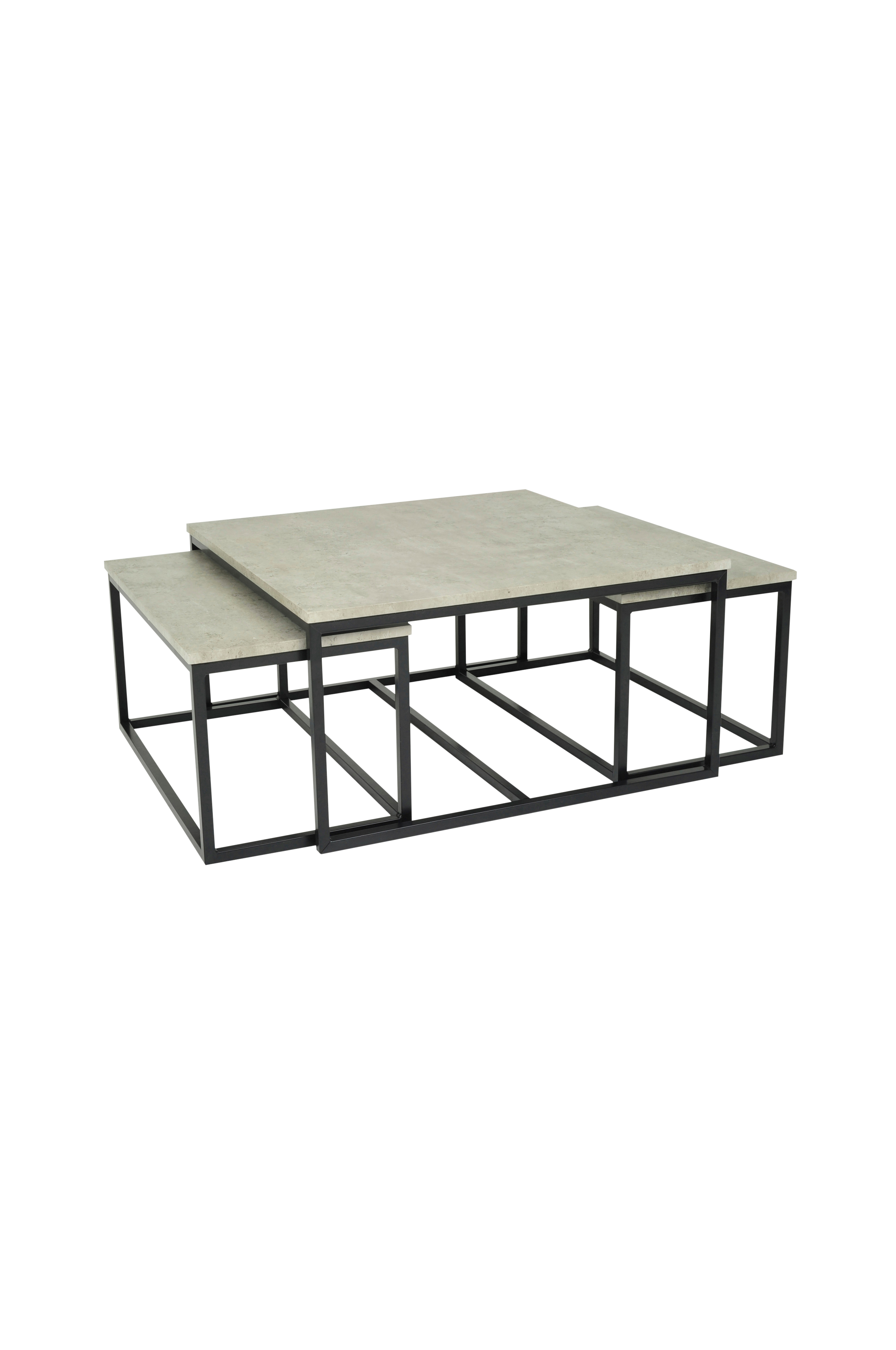 Sofabord med plade i betonlook og understel i sortlakeret metal. Bredde 80 cm, dybde 80 cm og højde 42 cm. Størrelse små borde: 73x38 x Højde 37 cm. Samlet.