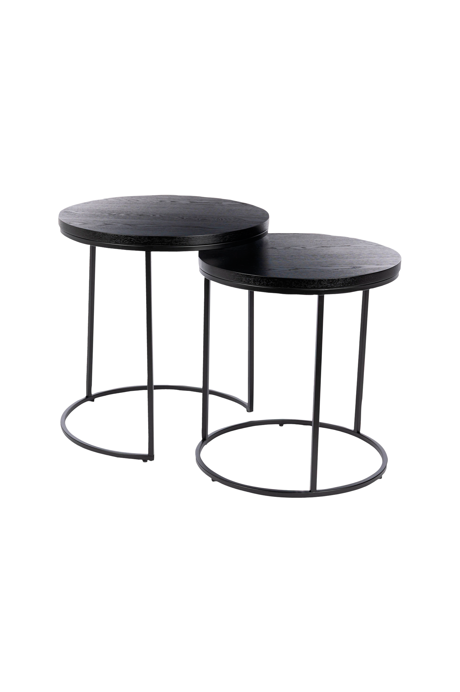 Et rundt sidebord med en top i lakeret askefinér og en slank, lakeret metalbase. Designet kombinerer en varm, naturlig træfinish med en minimalistisk metalramme, hvilket skaber et moderne og elegant look. Det mindste bord har en størrelse på ø45 og en højde på 49 cm. Varen kræver samling.