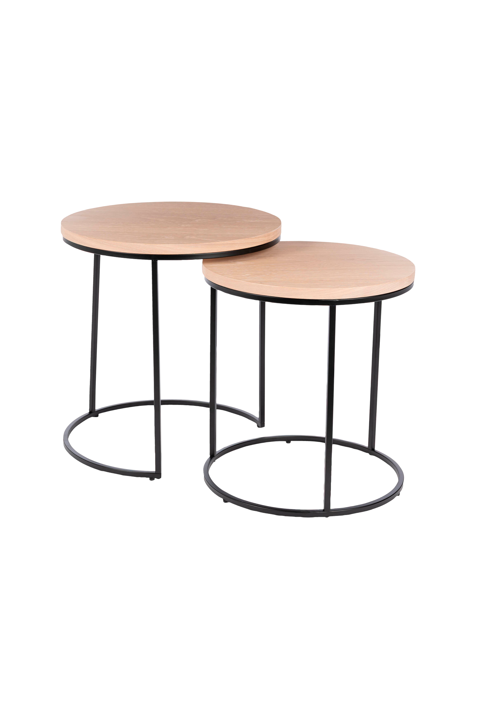 Et rundt sidebord med en plade af lakeret egefiner og en slank, lakeret metalbase. Designet kombinerer en varm, naturlig træfinish med en minimalistisk metalramme, hvilket skaber et moderne og elegant look. Det mindste bord har en størrelse på ø45 og en højde på 49 cm. Varen kræver samling.
