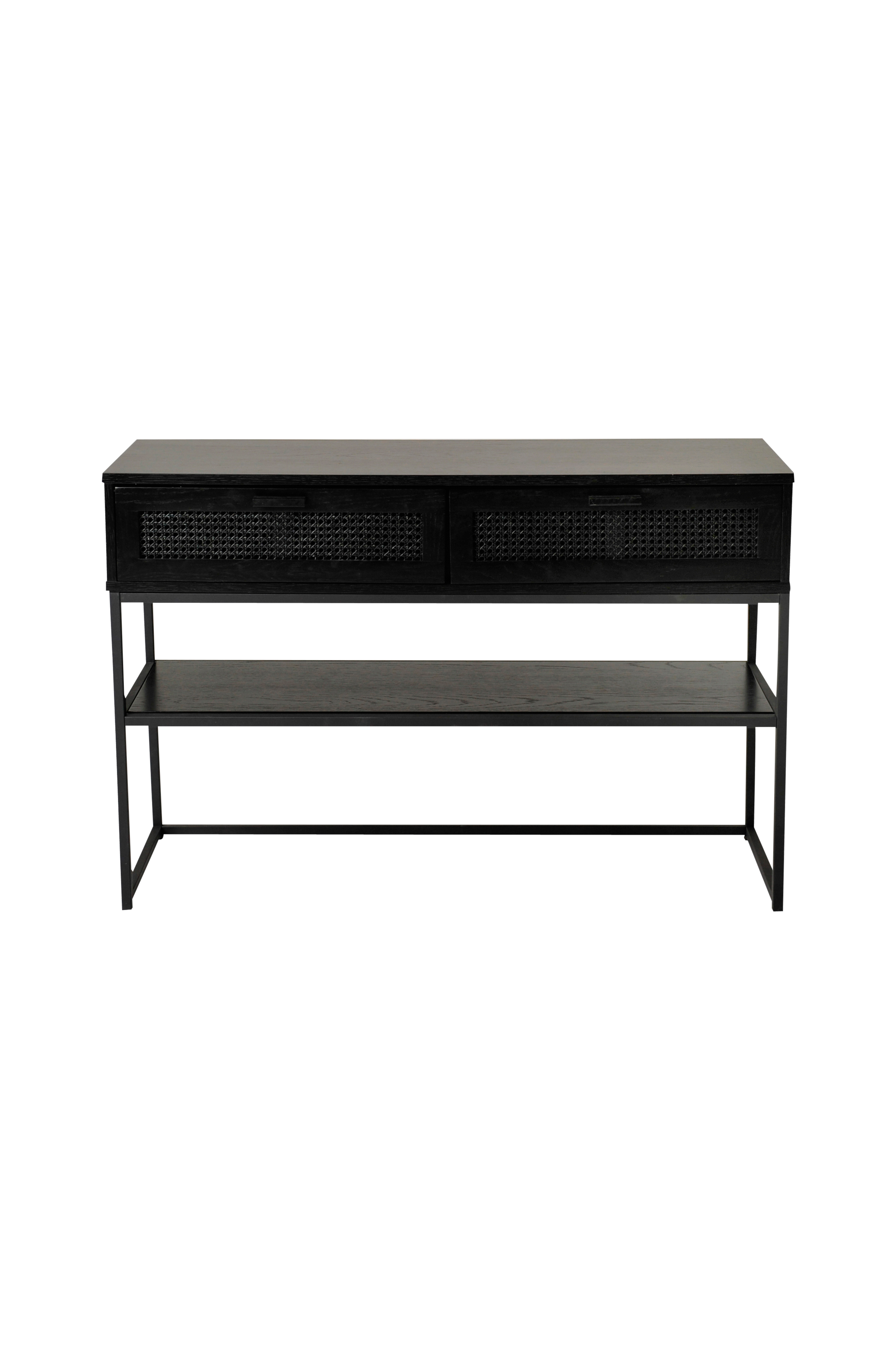 Konsolbord i lakeret eg, rotting og metal med 2 skuffer.