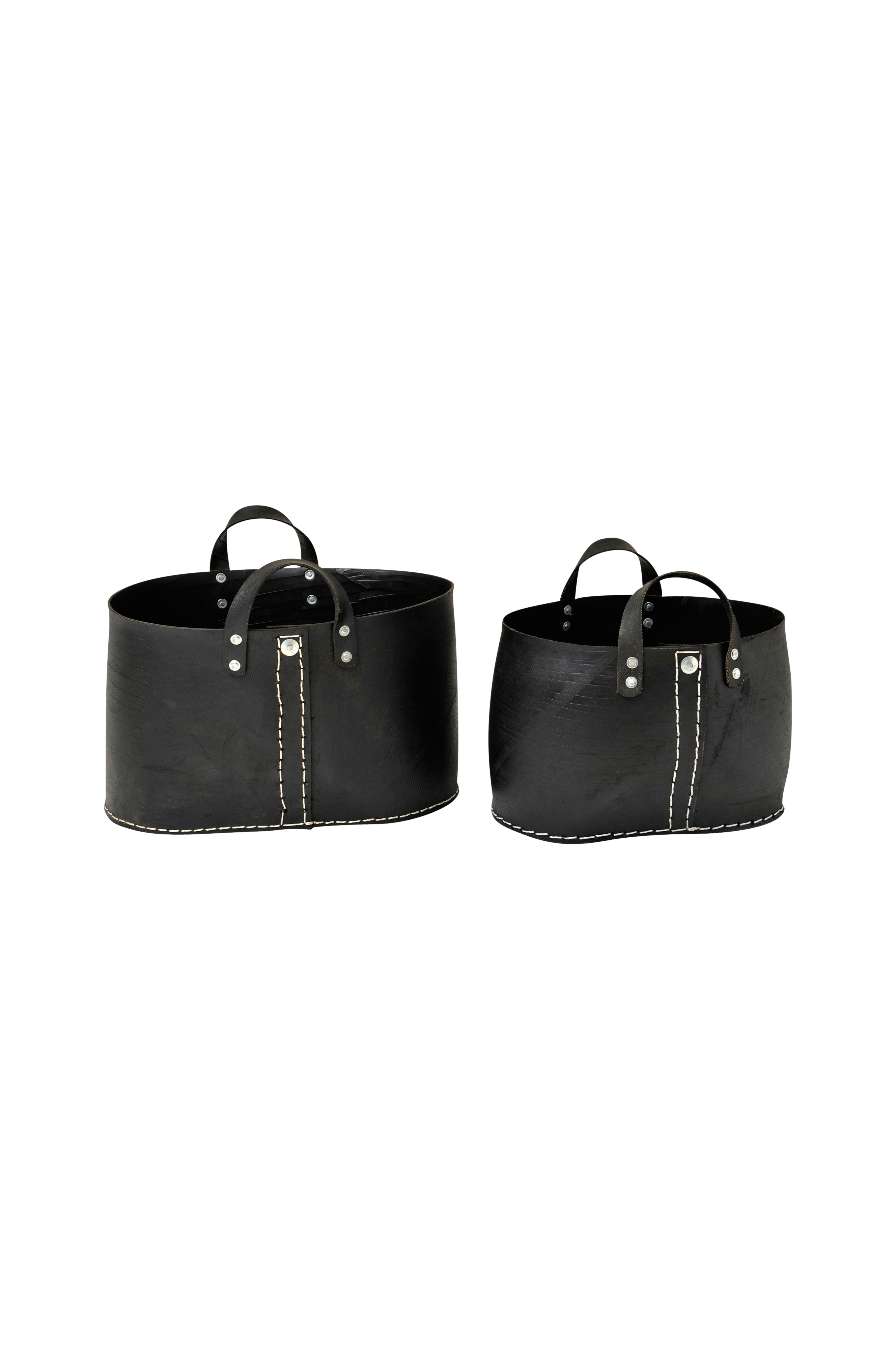 Kurvesæt med håndtag i genindvundet gummi. Dekorative sømme. Mål: stor kurv 55x28, højde 30 cm. Lille kurv 45x24, højde 25 cm.