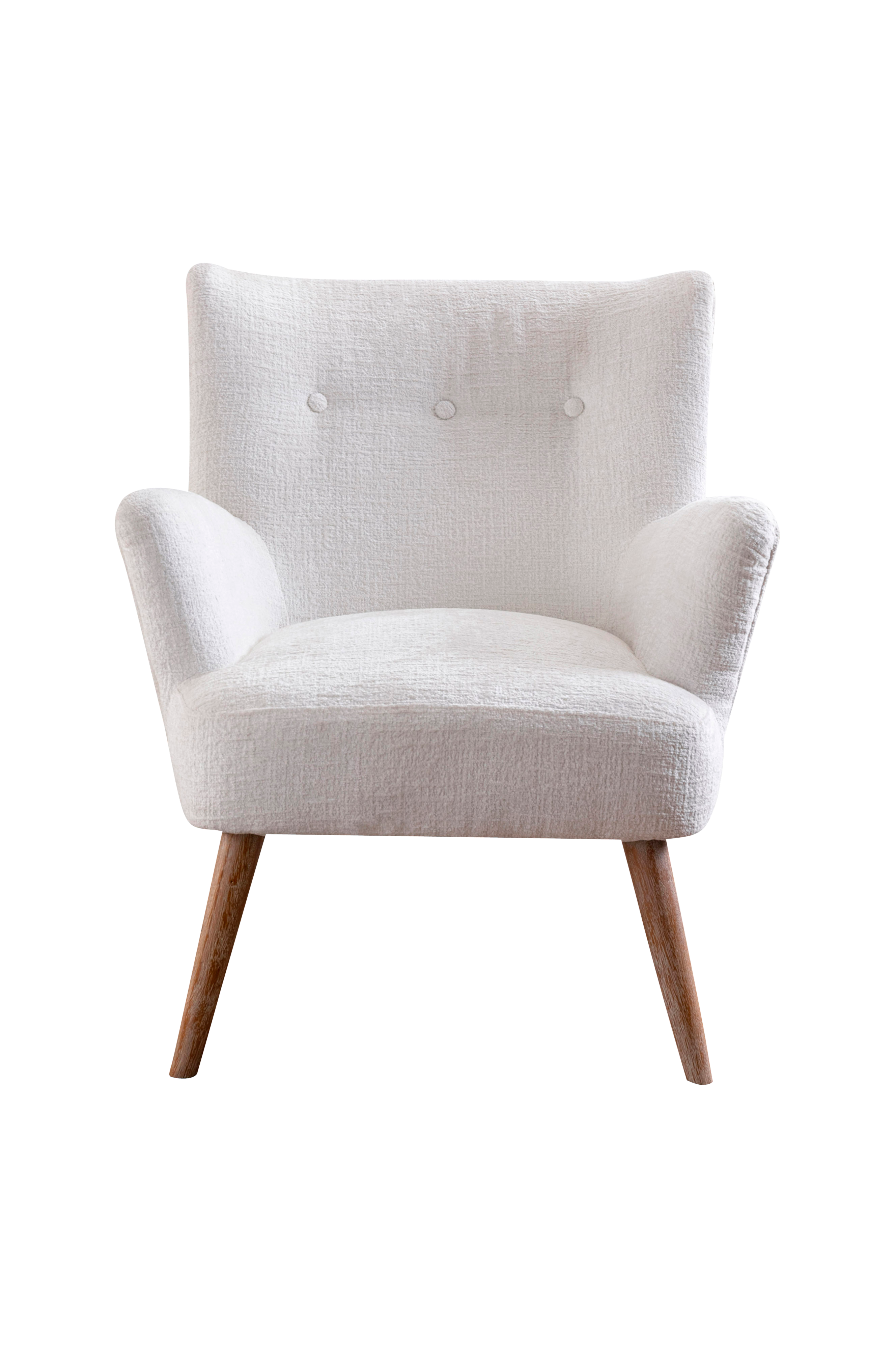 Lænestol i stof med lakerede træben. Knapper i ryggen.Bredde 73 cm, dybde 81 cm og højde 87 cm.
