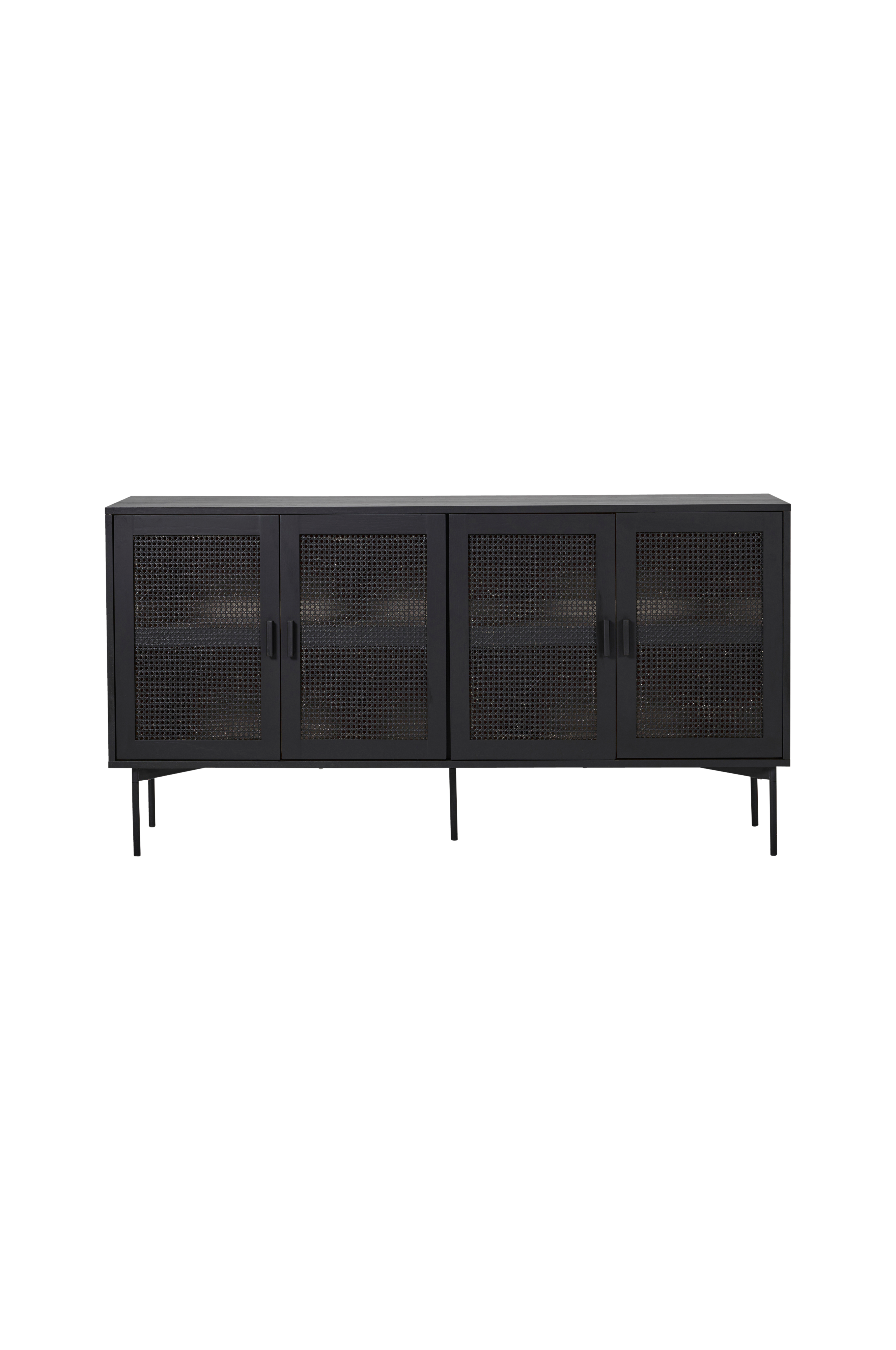 Skænk i lakeret eg, rotting og metal med 4 låger.1 justerbar hylde i hvert skab(2)Bredde: 175 cm, Dybde: 40 og Højde: 90 cm.Leveres usamlet.