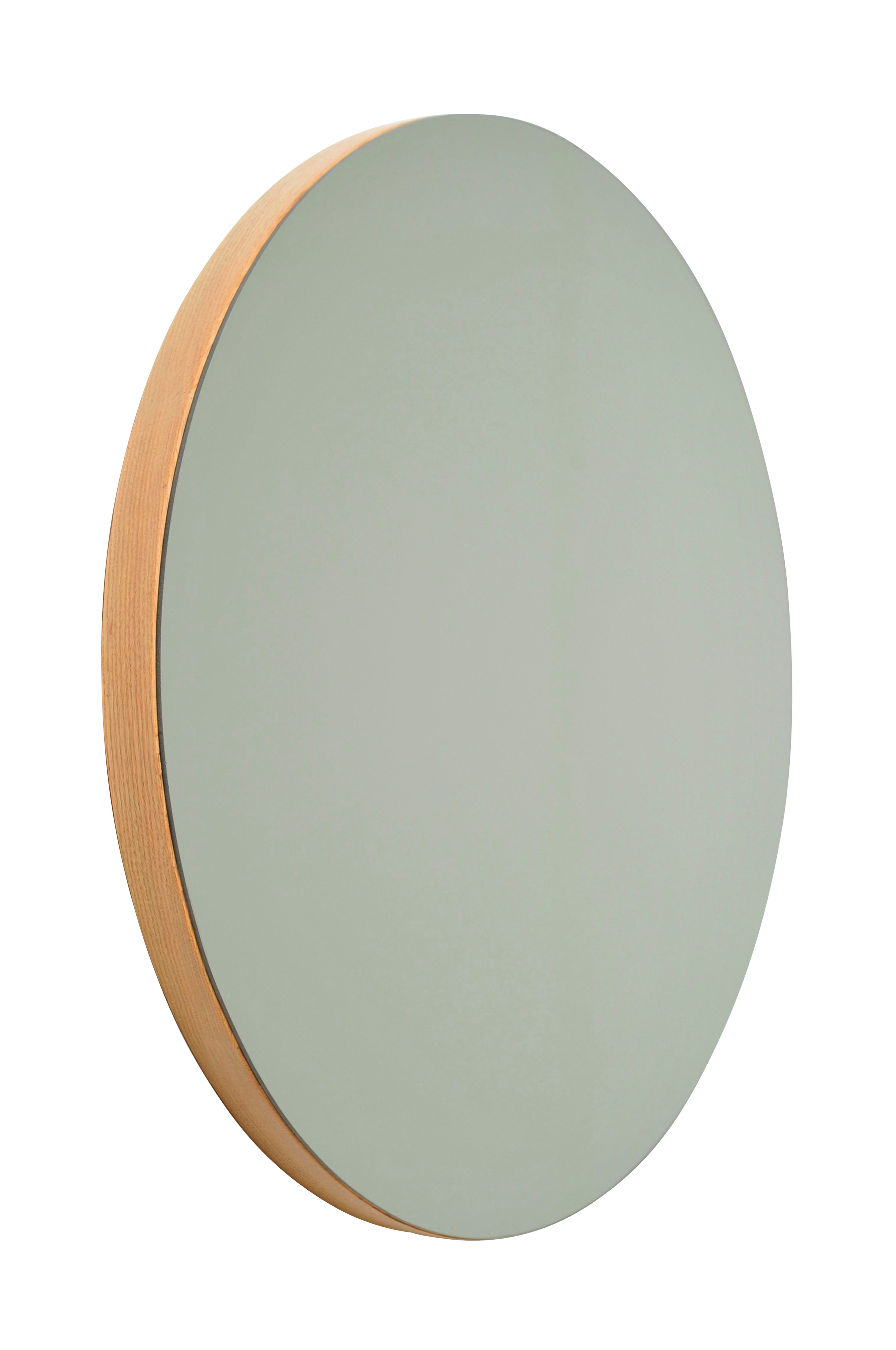 Rundt spejl med en fin egekant.Bredde: 70 cmDybde: 2,5 cmHøjde: 70 cm.