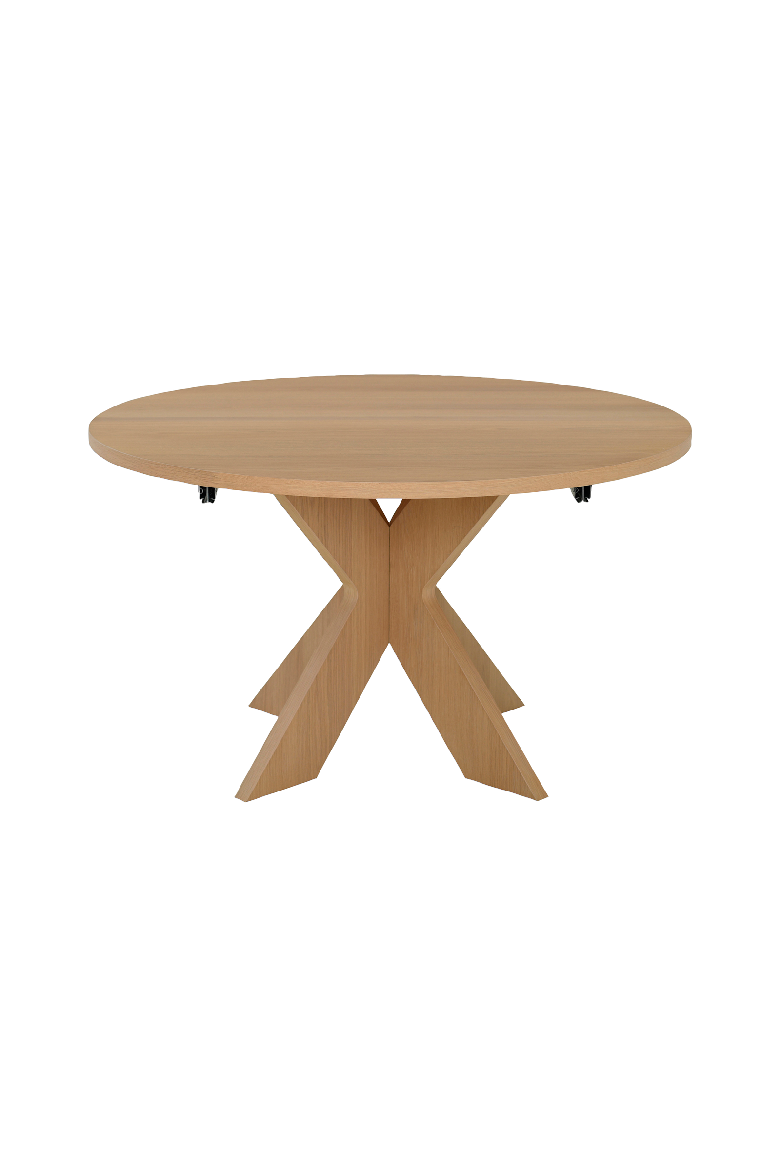 Bordet har en rund plade med et slankt, moderne design og et karakteristisk understel med krydsede ben, der giver et moderne præg. Det leveres med en tillægsplade, så du nemt kan udvide bordet til flere siddepladser, når du har brug for det.