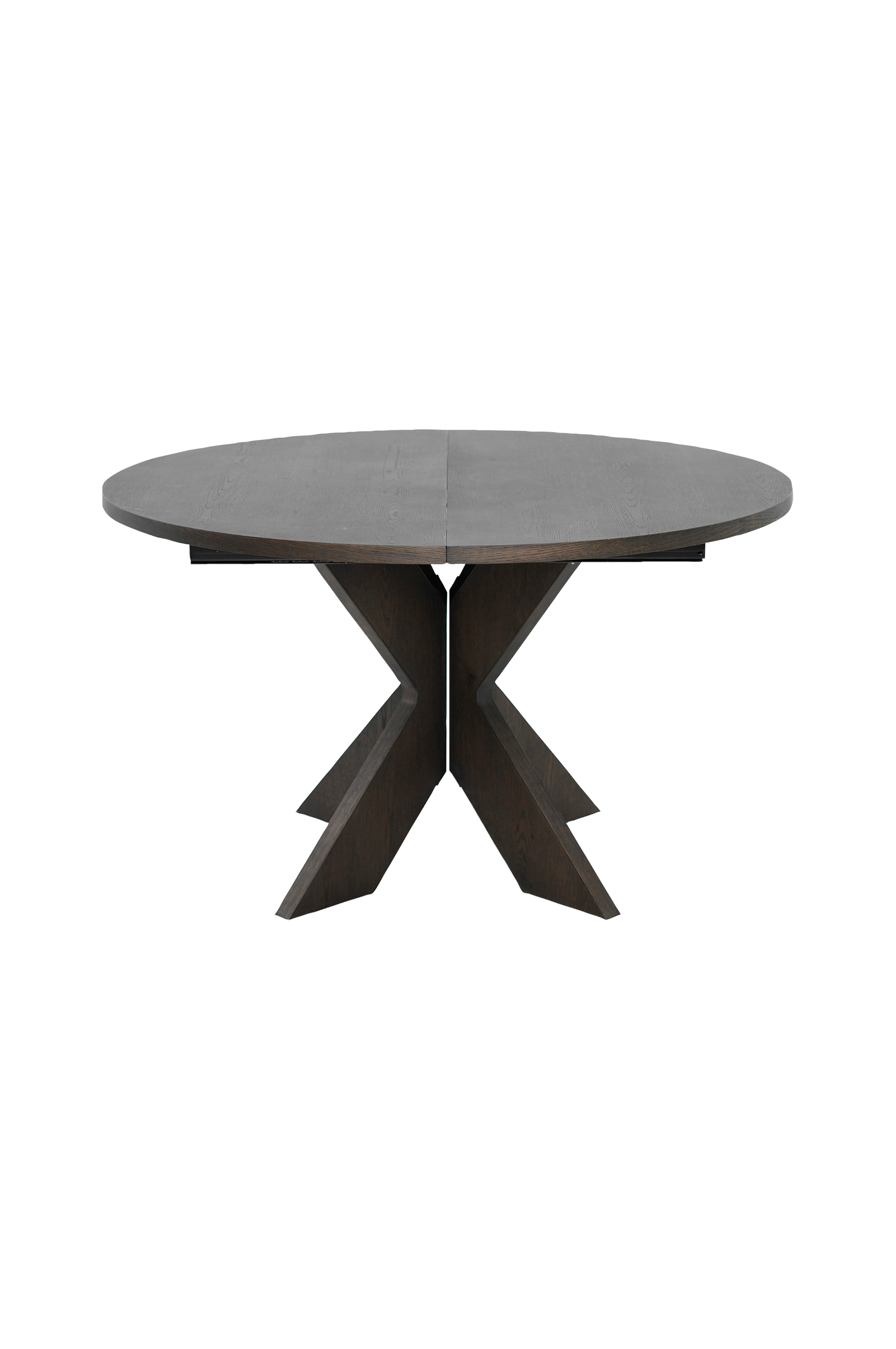 Bordet har en rund plade med et slankt, moderne design og et karakteristisk understel med krydsede ben, der giver et moderne præg. Det leveres med en tillægsplade, så du nemt kan udvide bordet til flere siddepladser, når du har brug for det.
