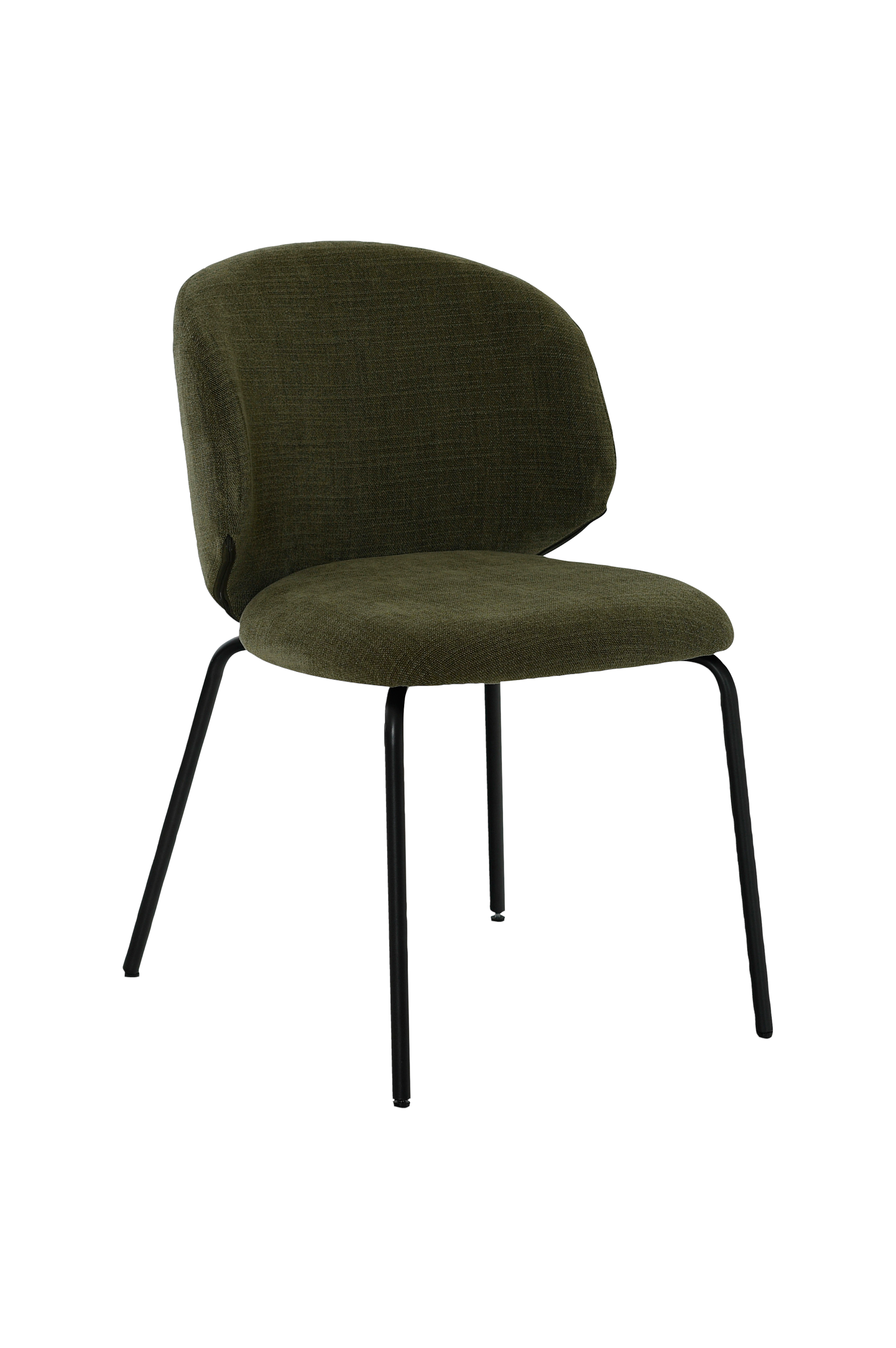 Dette er en moderne spisebordsstol med slanke, lakerede metalben. Sædet og ryglænet er polstret for komfort og betrukket med et blødt, struktureret stof i en neutral tone.