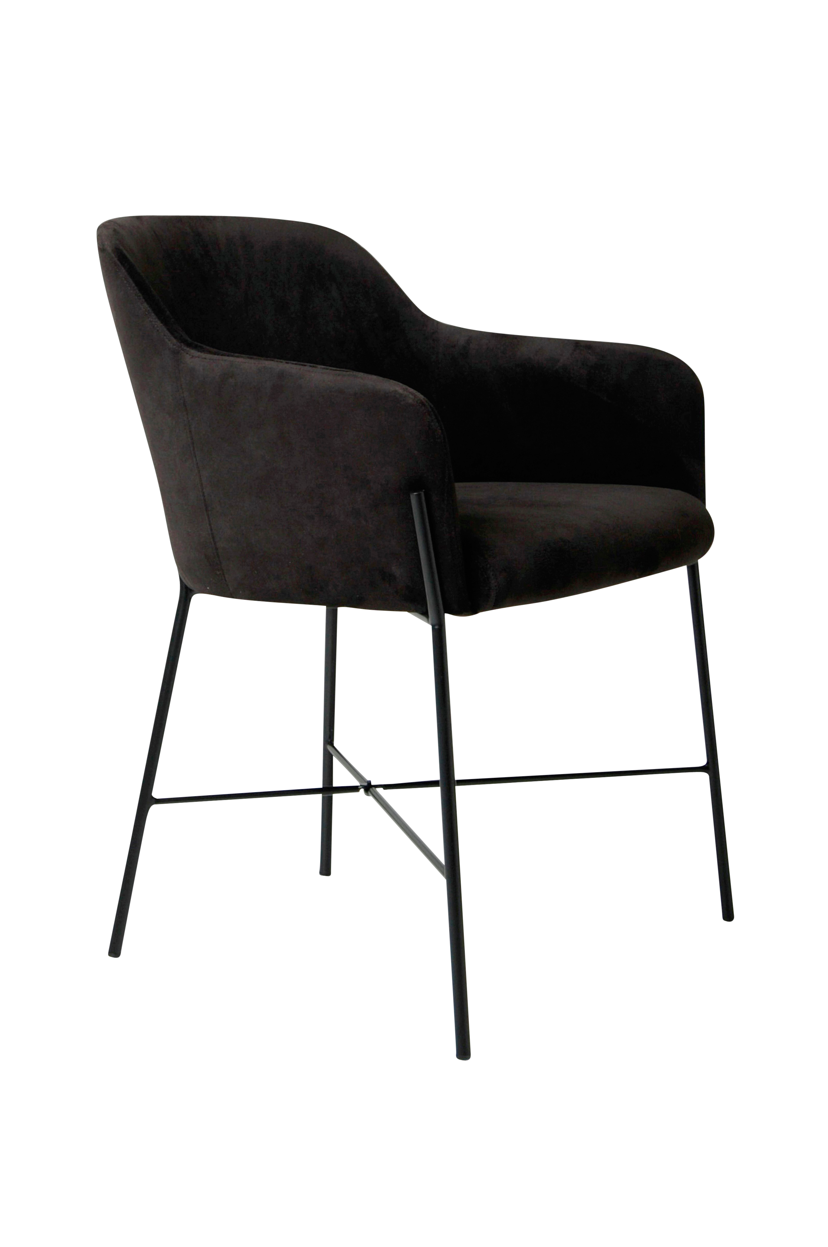 Behagelig spisebordsstol med armlæn i velour og lakeret metalunderstel. Sælges i 2 pak.