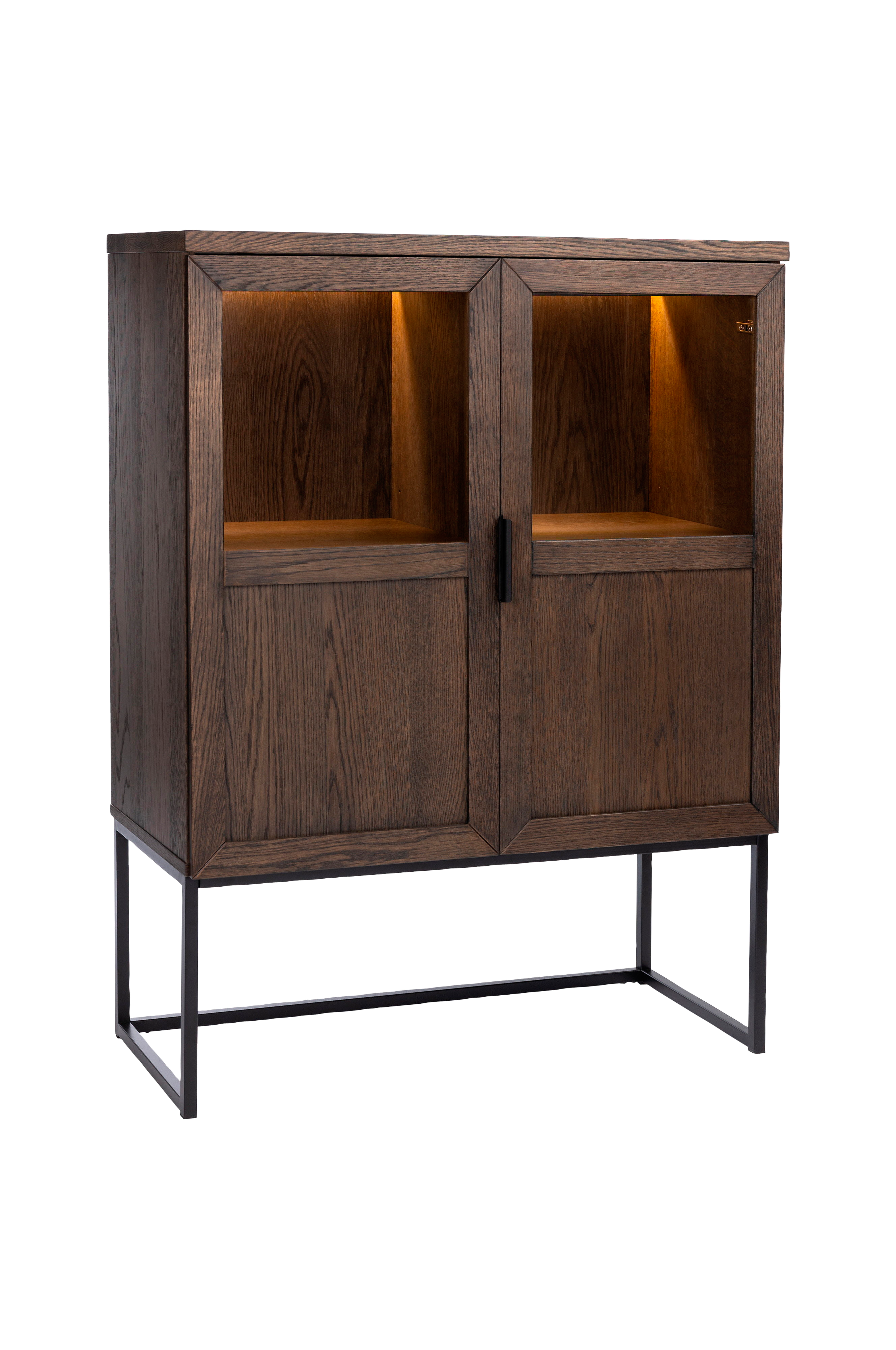 Elegant vitrineskab med en stram metalbase. 2 døre.Skænken er fremstillet af olieret eg. Soft close på døre.Varen kræver samling.