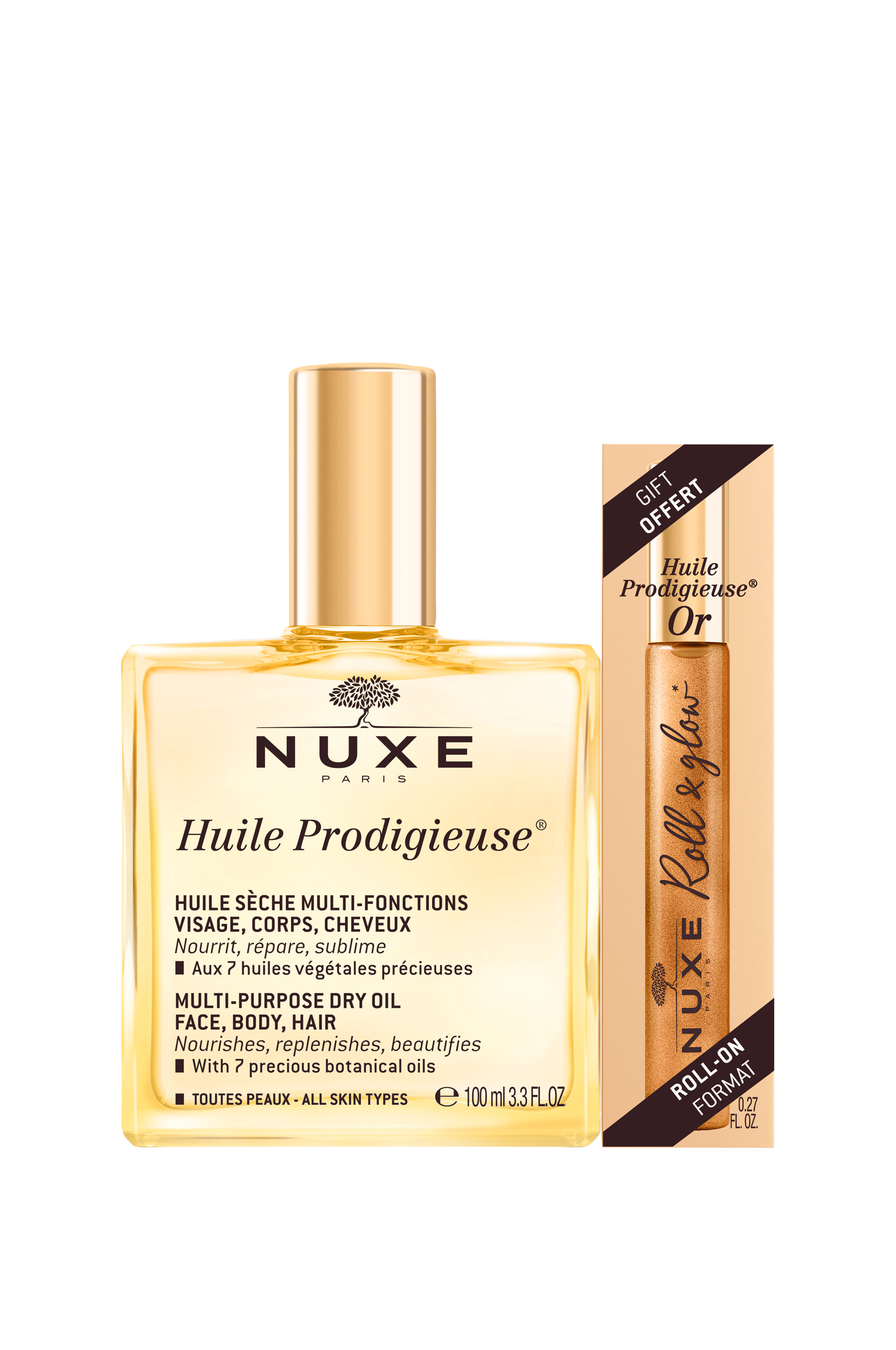 Giv næring, fugt og pleje dit ansigt, krop og hår - og forstærk dine smukke træk og din solbeskinnede hud med en gylden shimmer! I denne limited edition emballage fra Nuxe finder vi deres ikoniske og multifunktionelle tørolie Huile Prodigieuse Multipurpose Dry Oil i fuld størrelse, samt Roll On Huile Prodigieuse Gold som har de samme fantastiske egenskaber, men også en dejlig guldglimmer. Den praktiske roll-on flaske er nem at tage med og giver dig et perfekt, gyldent skær lige der, hvor du ønsker det.