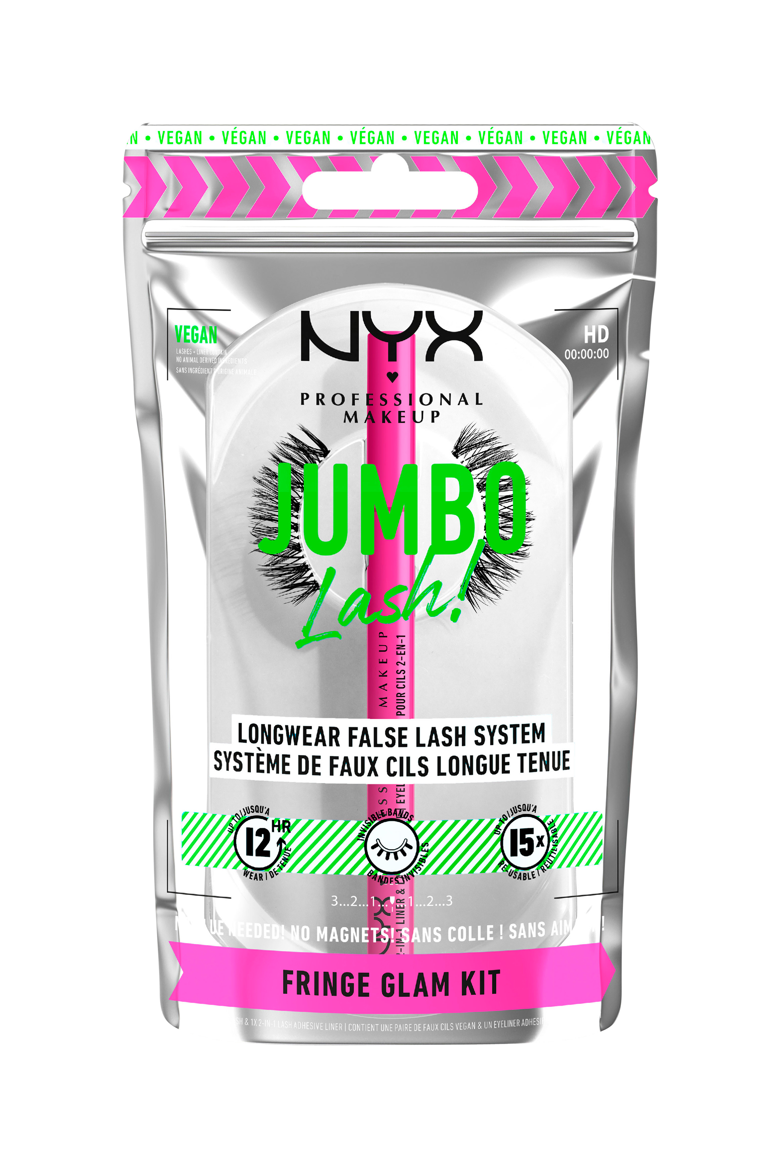 Nu introducerer NYX Professional Makeup sit nye veganske*, smarte og hurtige kit til kunstige øjenvipper: Jumbo Lash! Longwear False Lash System. Nu kan du også få jumbo-vipper i bare 2 trin med jumbovolumen, jumbolængde og jumboeffekt hele dagen! Usynligt og fleksibelt vippebånd, lette og behagelige at bære og kan bruges op til 15 gange. Brug flere vipper oven på hinanden for maksimal effekt! Ingen ekstra lim, ingen magneter - bare et smukt resultat som holder i op til 12 timer. Påfør først vores 2-in-1 Liner & Adhesive og derefter dine foretrukne Jumbo Lash-vipper. Det er alt, hvad der kræves for at skabe et "false lash-look" som ser professionelt ud.