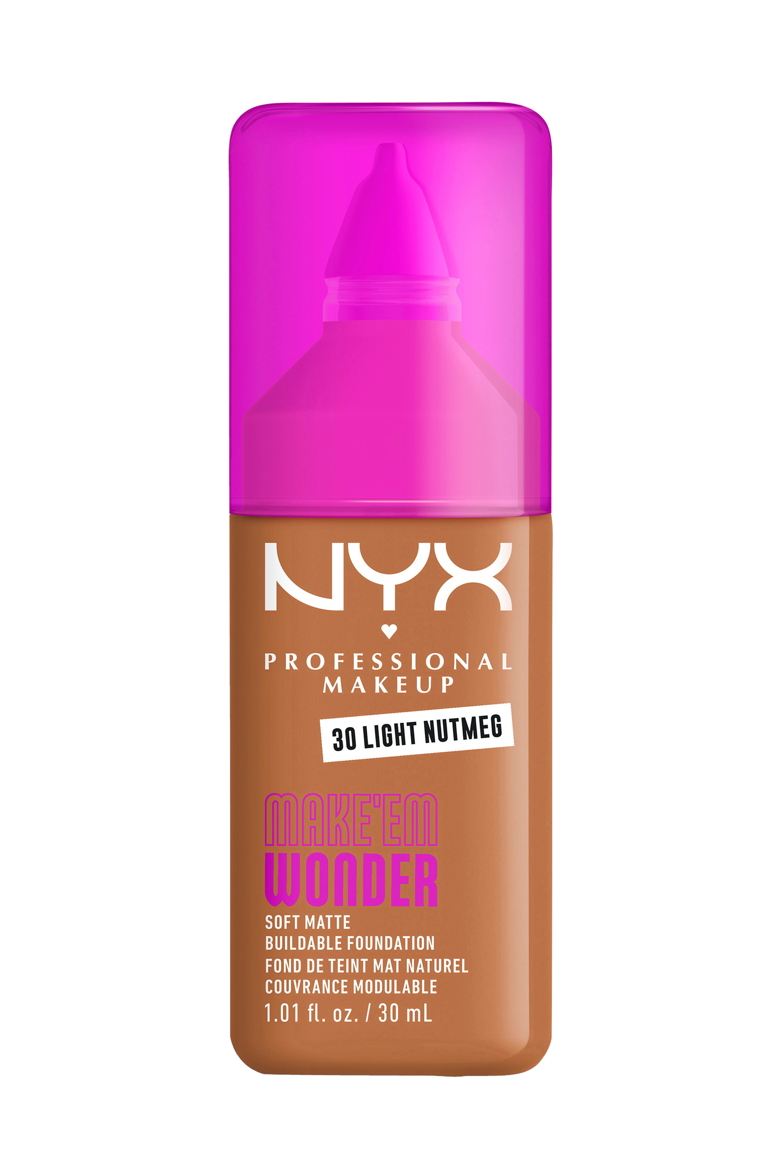 MAKE 'EM WONDER om det er foundation eller om det virkelig er din egen hud med denne bløde, matte og opbyggelige formel.NYX Professional Makeup Make'em Wonder foundation er beriget med hudplejeingredienser, dækker alt men føles stadig vægtløs på din hud. Holder hele dagen og ligner din hud - bare mere glat, jævn og strålende. Formlen er beriget med guaranaekstrakt, som er kendt for at give glød, og hyaluronsyre for øjeblikkelig fugt uden at formlen klumper sammen. Opbyg formlen til til dækning af huden du ønsker, uanset om du er til no-makeup look eller fuld glam. Formlen falmer ikke, smitter ikke af, svedresistent, vandfast, ser strålende ud hele dagen.