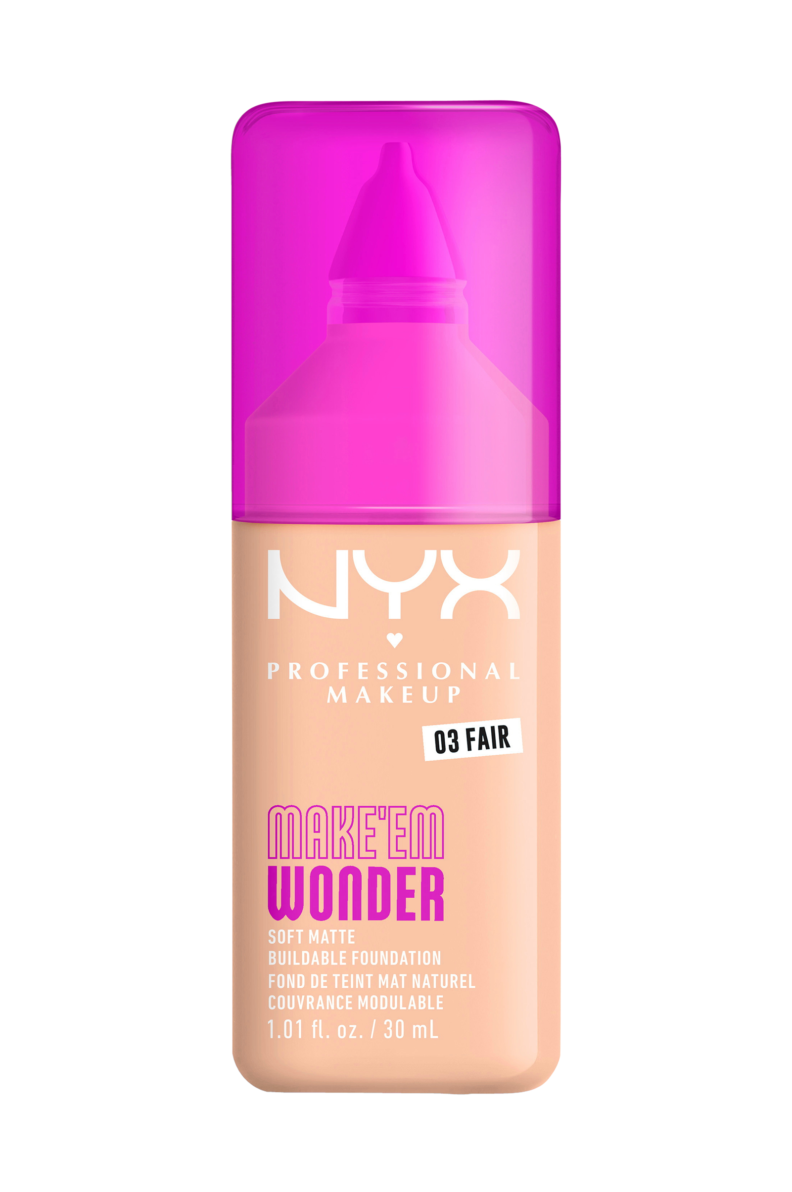 MAKE 'EM WONDER om det er foundation eller om det virkelig er din egen hud med denne bløde, matte og opbyggelige formel.NYX Professional Makeup Make'em Wonder foundation er beriget med hudplejeingredienser, dækker alt men føles stadig vægtløs på din hud. Holder hele dagen og ligner din hud - bare mere glat, jævn og strålende. Formlen er beriget med guaranaekstrakt, som er kendt for at give glød, og hyaluronsyre for øjeblikkelig fugt uden at formlen klumper sammen. Opbyg formlen til til dækning af huden du ønsker, uanset om du er til no-makeup look eller fuld glam. Formlen falmer ikke, smitter ikke af, svedresistent, vandfast, ser strålende ud hele dagen.