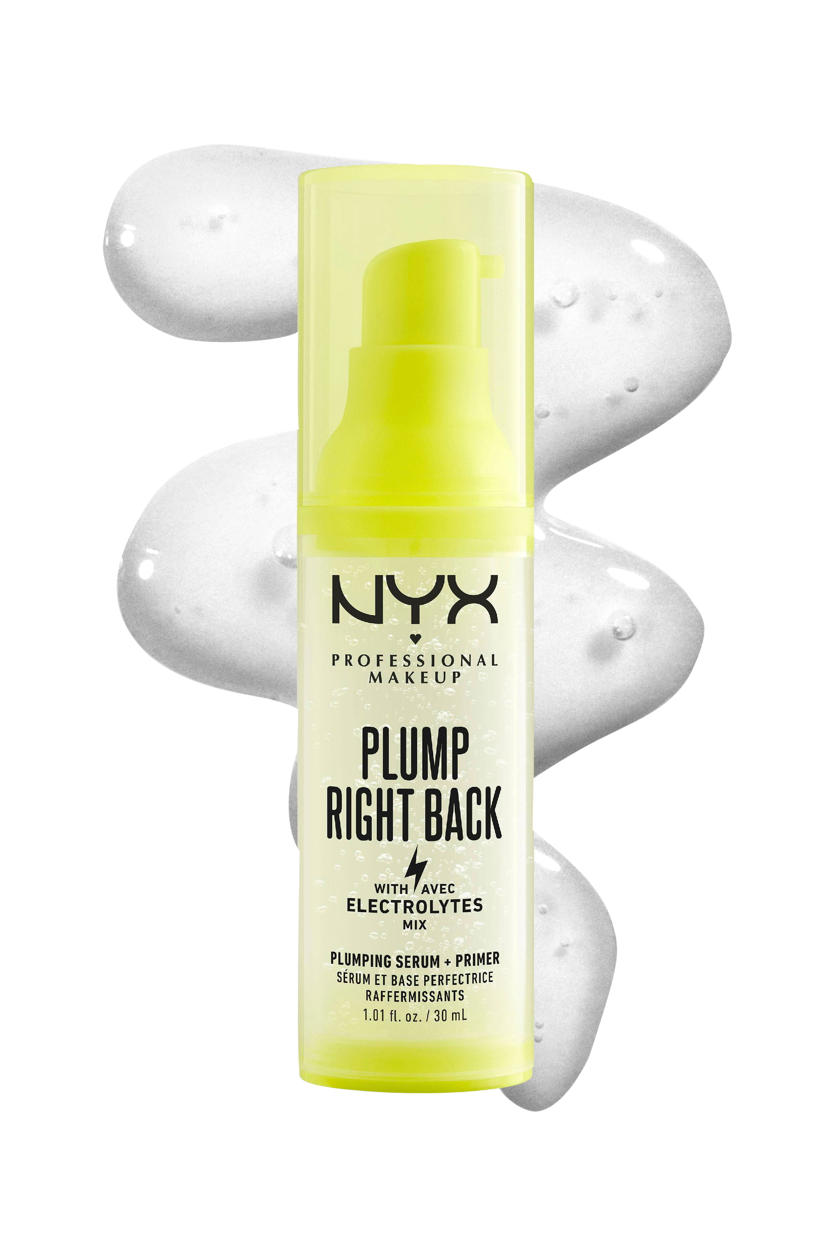 Plump Right Back Primer + Serum fra NYX Professional Makeup gør øjeblikkeligt huden glattere for en ensartet base før din makeup. Huden føles hydreret og fuld med en følelse af fornyet energi. Denne superprimerserum er beriget med 3 typer elektrolytter + 2 vitaminer (hyaluronsyre, vitamin E, pro-vitamin B5, magnesium og kalium) og giver huden en fugtmættet følelse og et fyldigt look, samtidig med at det forlænger holdbarheden af din makeup. Den veganske formel føles let på huden og absorberes hurtigt, så din hud er klar til makeup.
