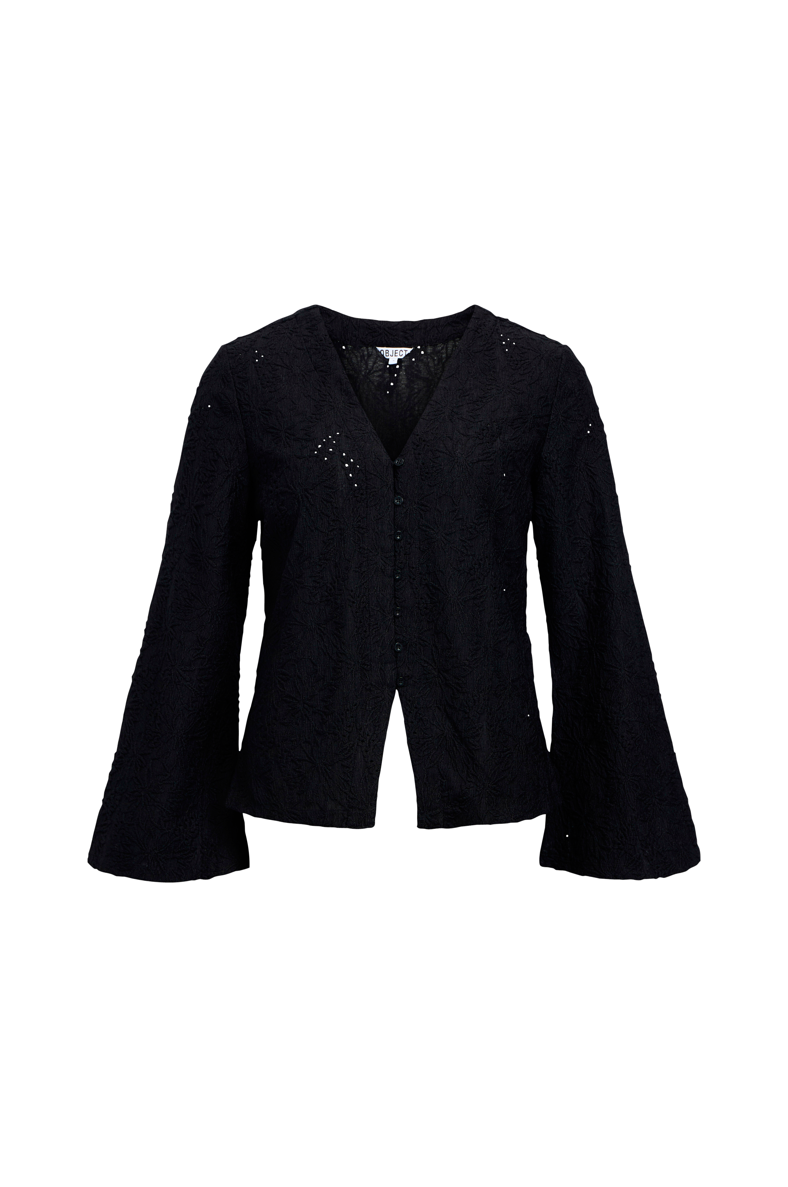 • Semitransparent bluse med dekorativt broderi• V-udskæring• Lange trompetærmer• Knaplukning• Slids nede foran