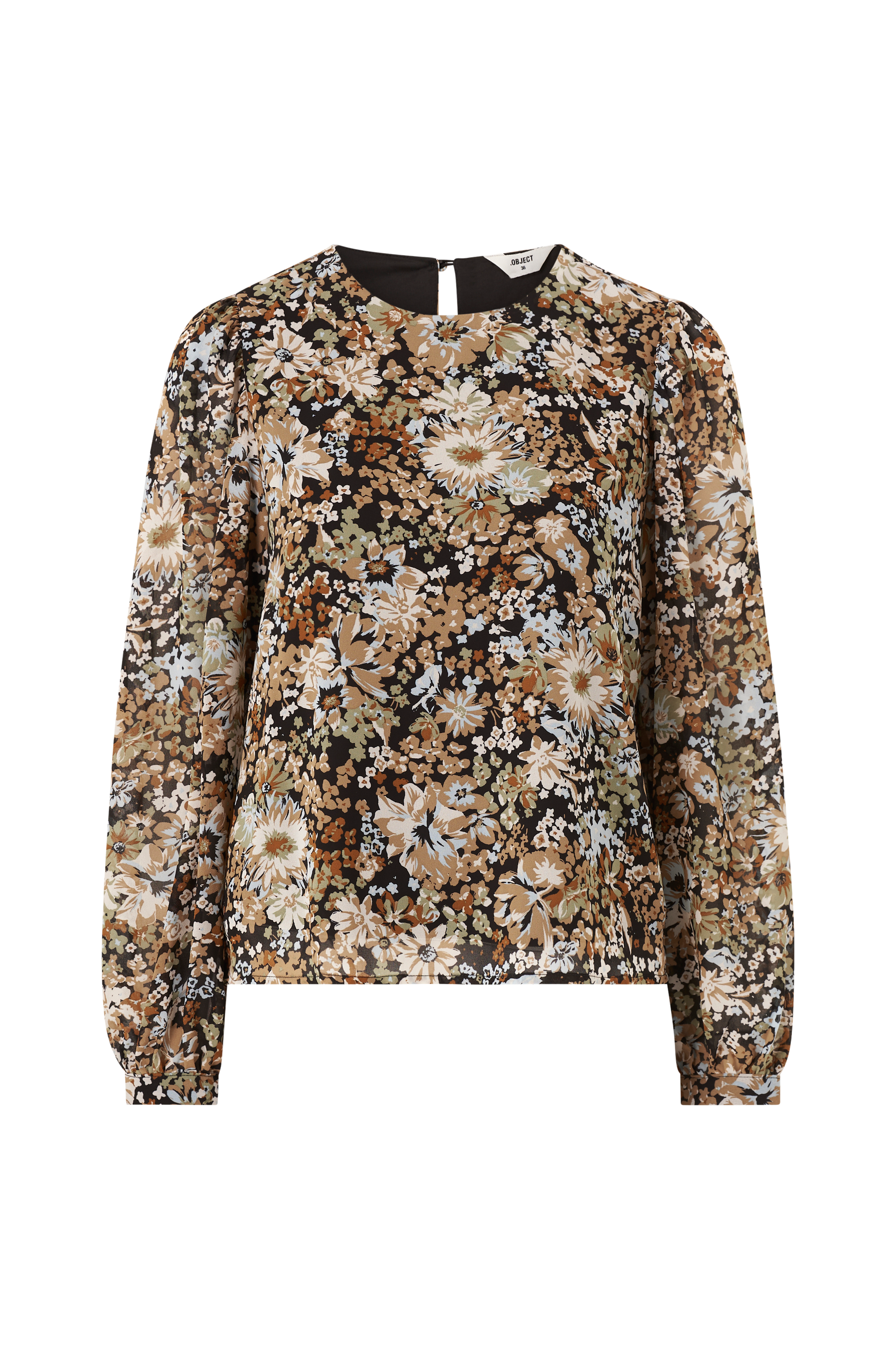 Langærmet bluse i to lag. Det øverste lag er i transparent mesh og det inderste i stretchjersey. Transparente pufærmer med rynkning ved skuldrene og ærmekant. Rund hals med slids og knap i nakken. Smal manchet med en knap.