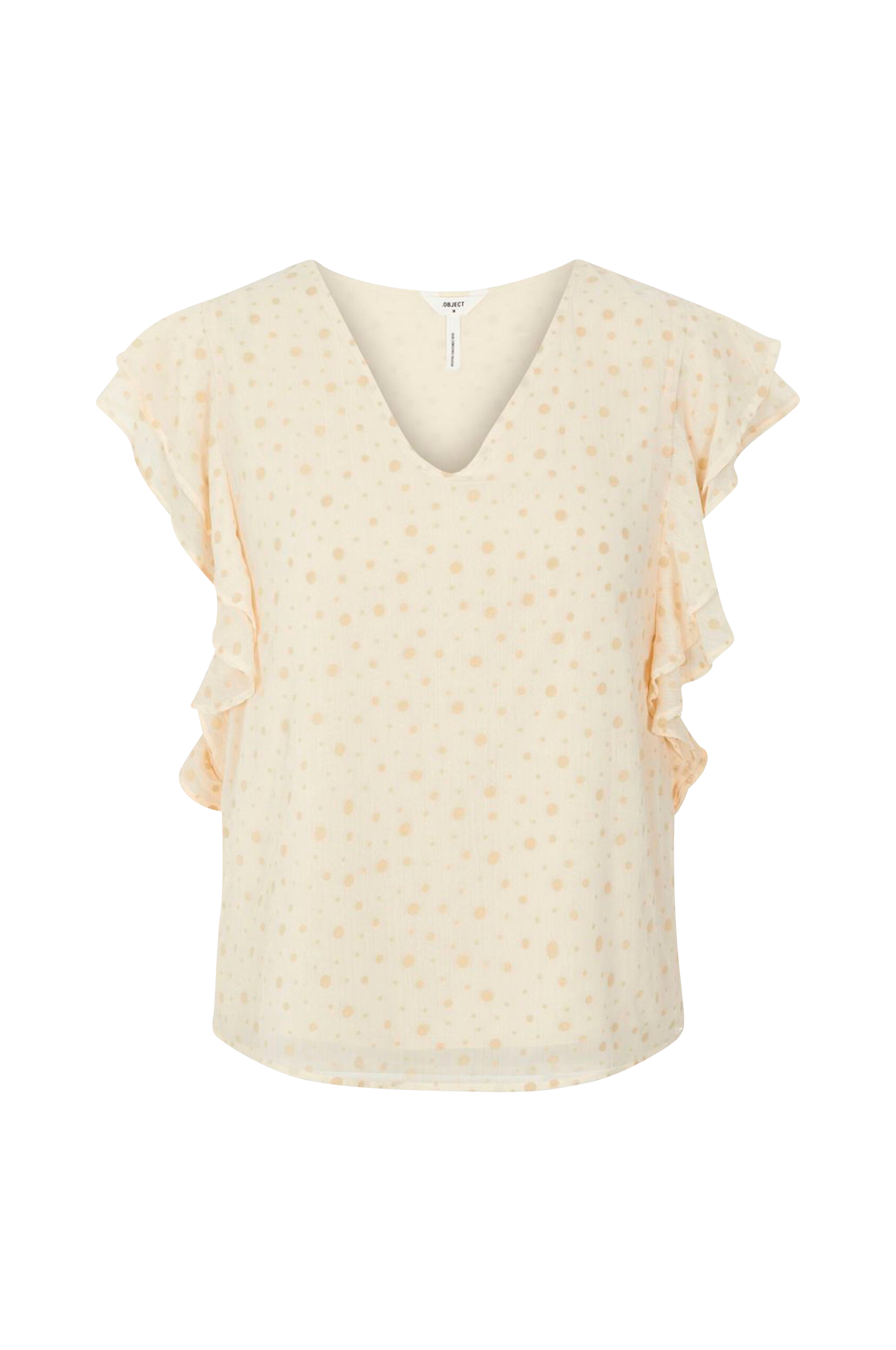 Top i lige model af chiffon med vævede velourprikker over det hele. V-hals og dobbelte flæser i siderne over skuldrene. Foret.