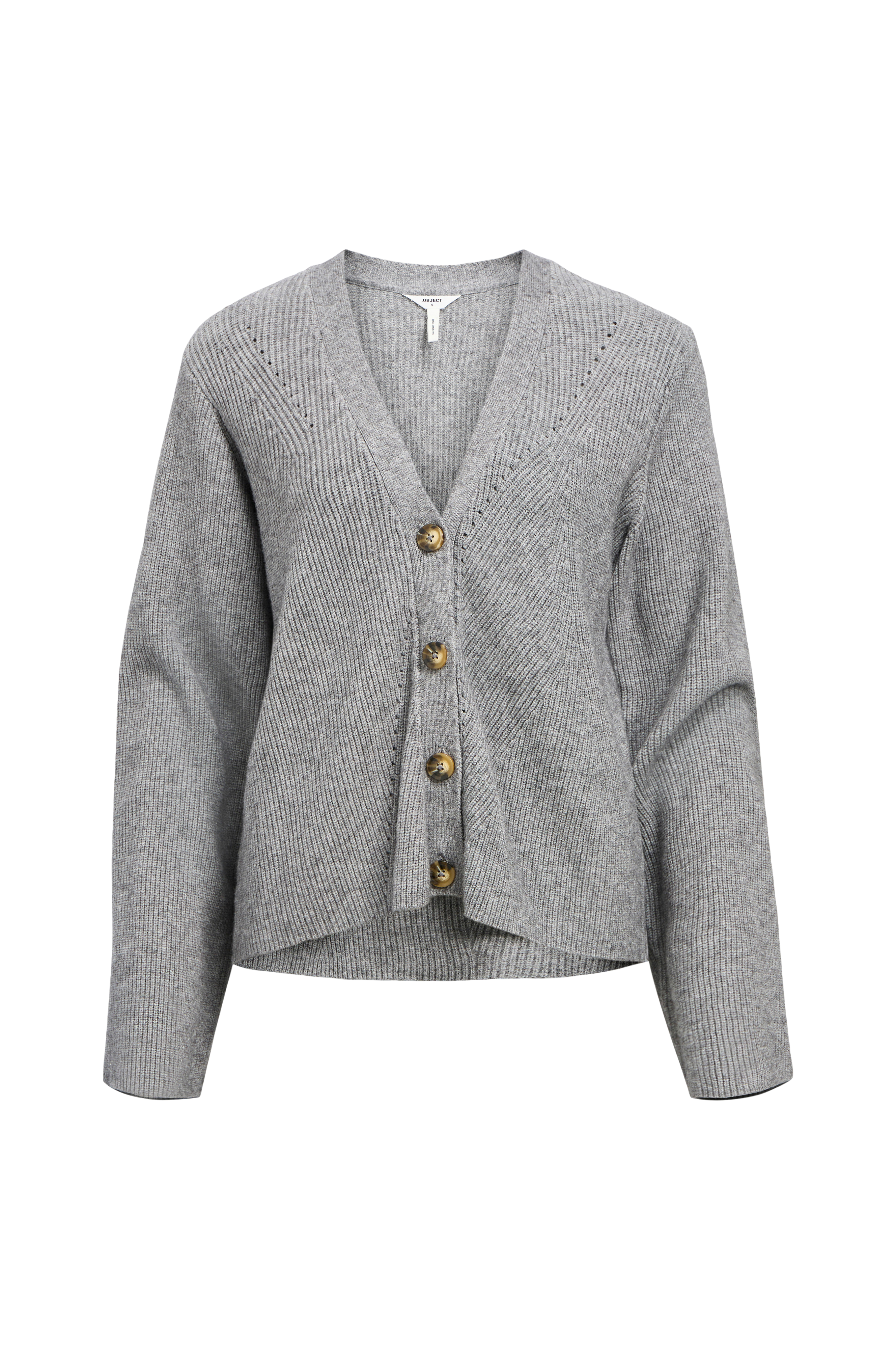 • Mønstervævet model• V-formet halsudskæring• Langt ærme med svaj• Knapper foran• Små slidser nede i siderne