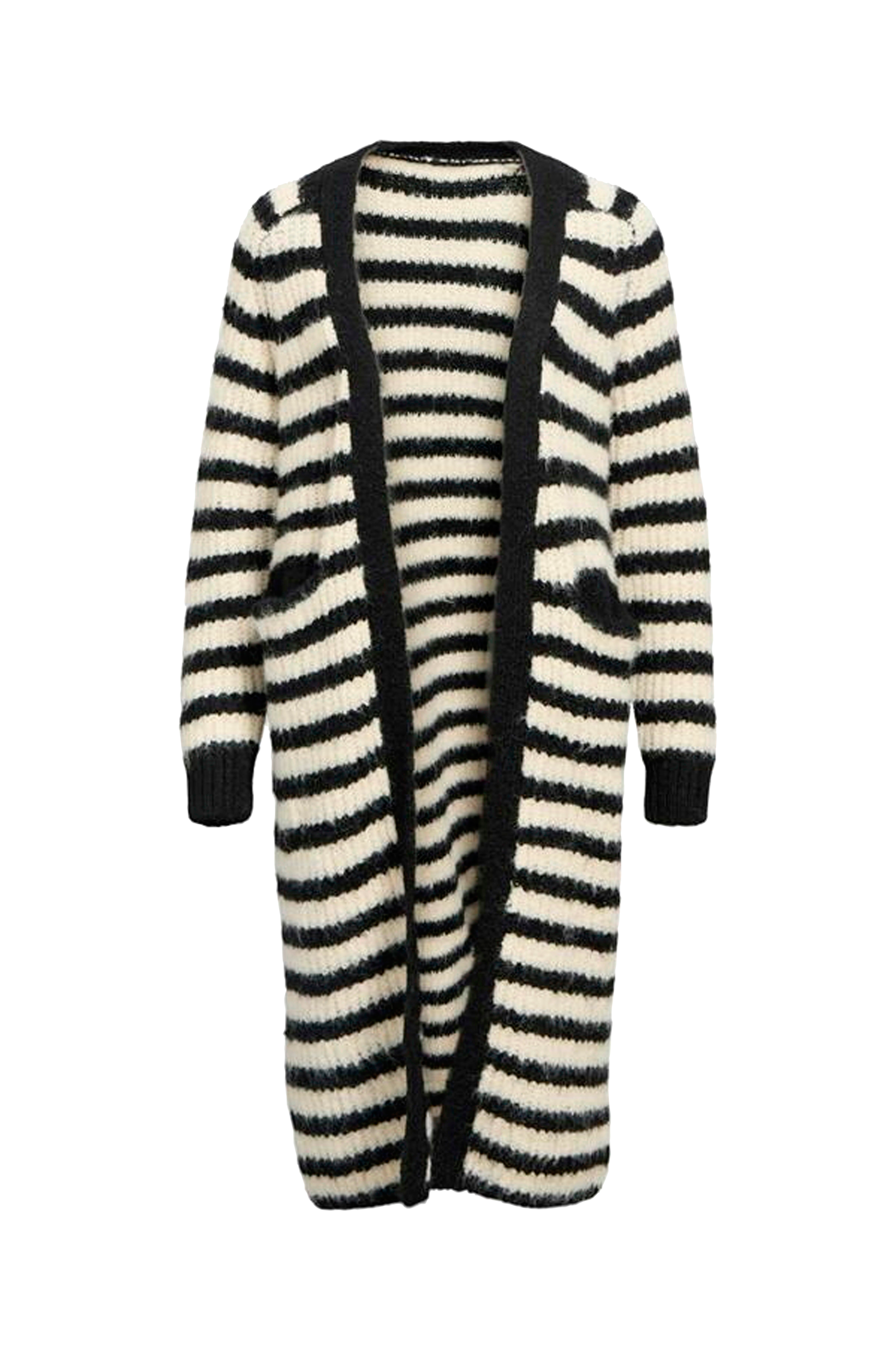 • Lang, mønsterstrikket cardigan i uldmiks• Åben model• Ribstrik ved manchetterne