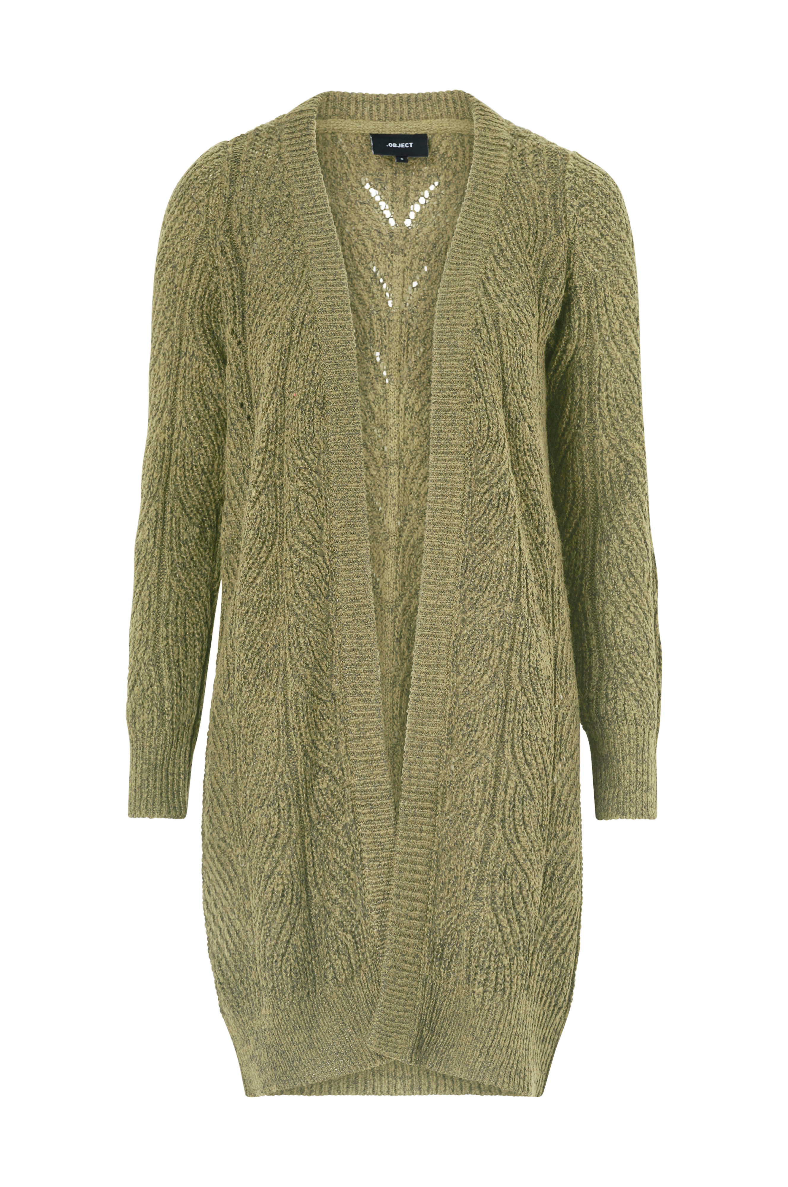 Cardigan objNova Stella L/S Knt fra Object i mellemlang strukturstrikket model i bomuldsblanding med ribstrikket kant forneden, i ærmekant og forkant. Åben foran.