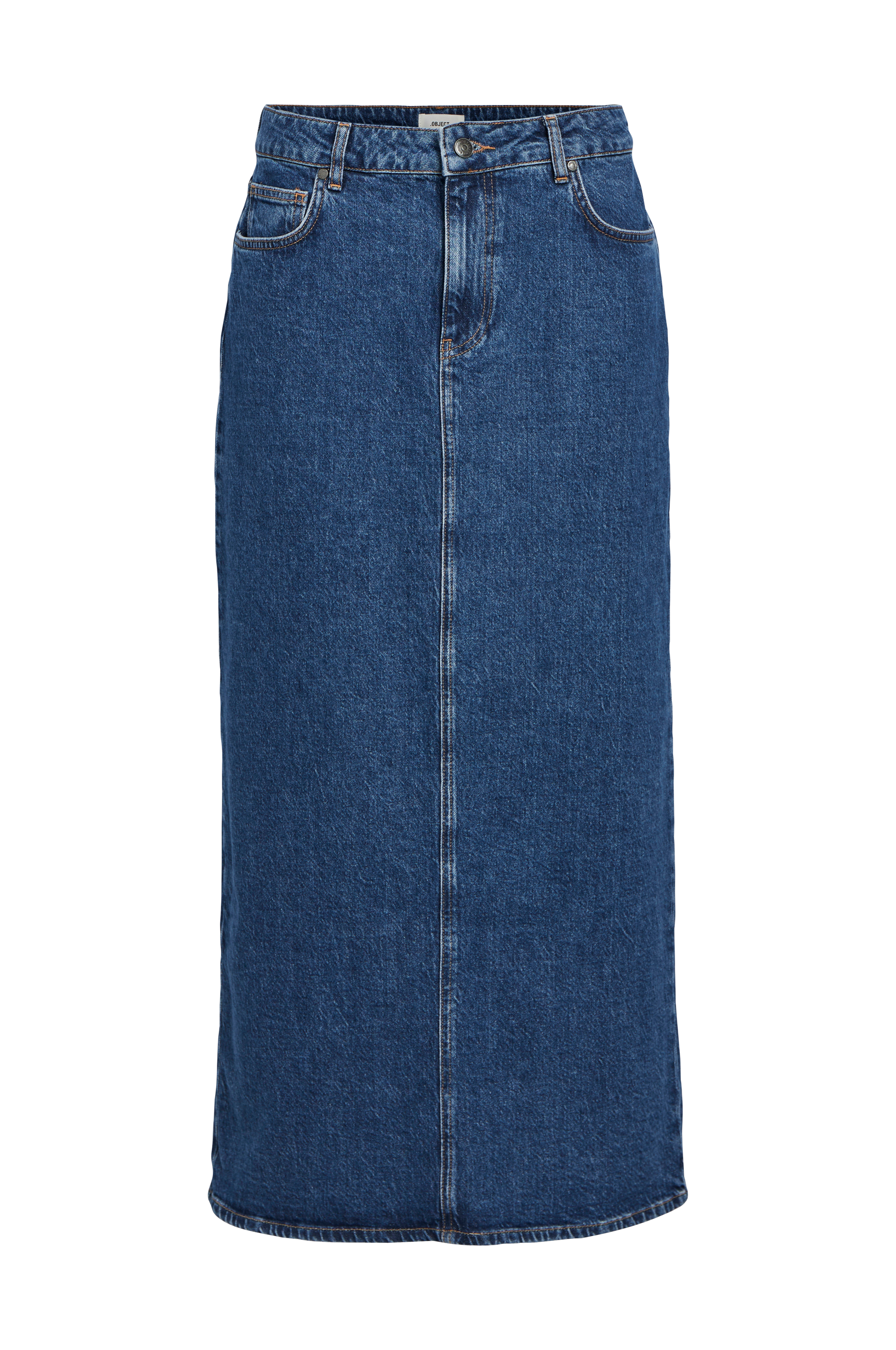 • Lang nederdel i denim• Femlommemodel• Gylp med lynlås• Slids bagpå• Længde: 94 cm i størrelse S