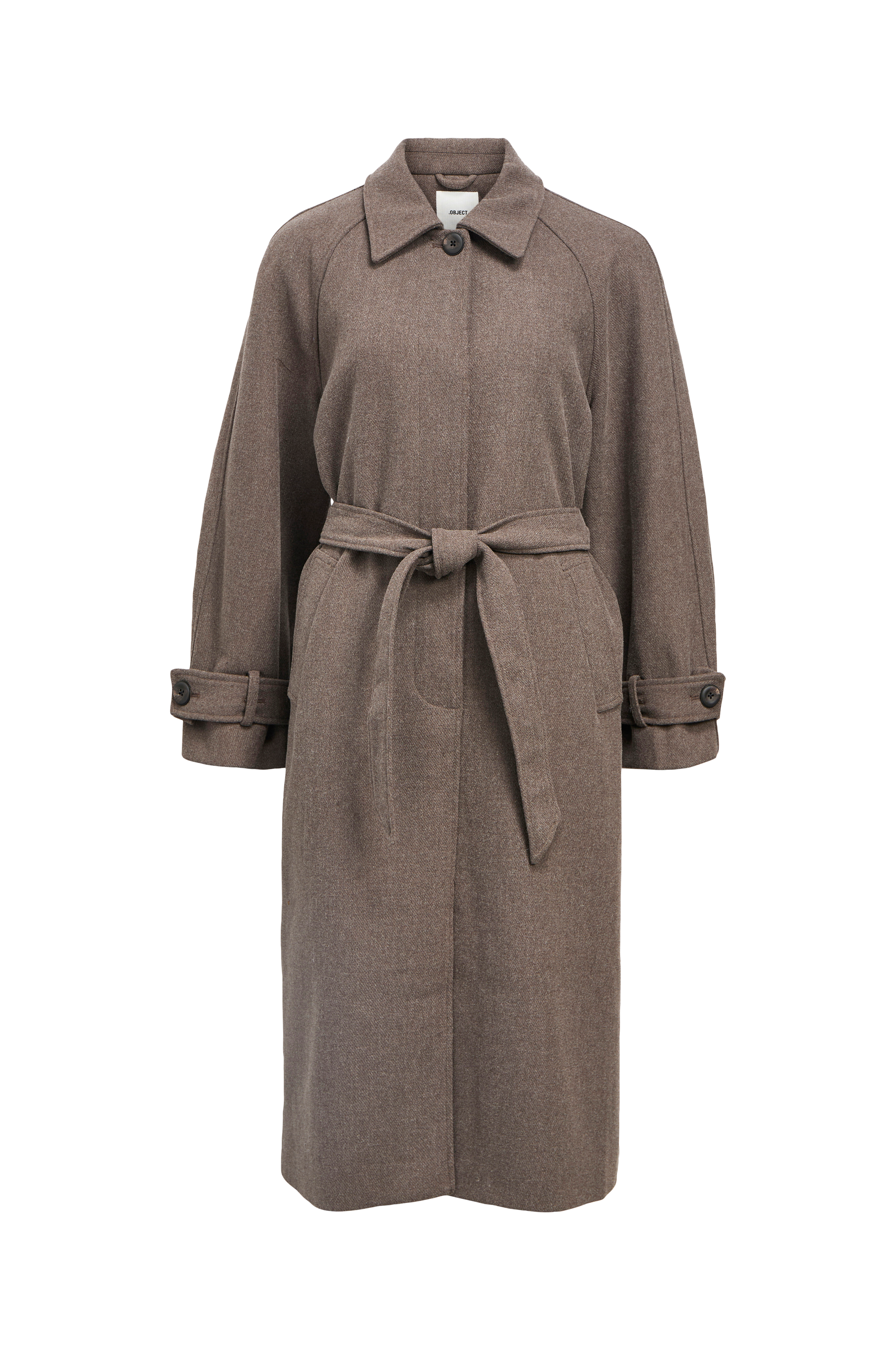 • Foret frakke i uldmiks med krave• Skjult knaplukning foran foran• Bindebælte ved taljen• Sidelommer• Stropper ved ærmeafslutningerne• Længde: 118 cm i størrelse 36