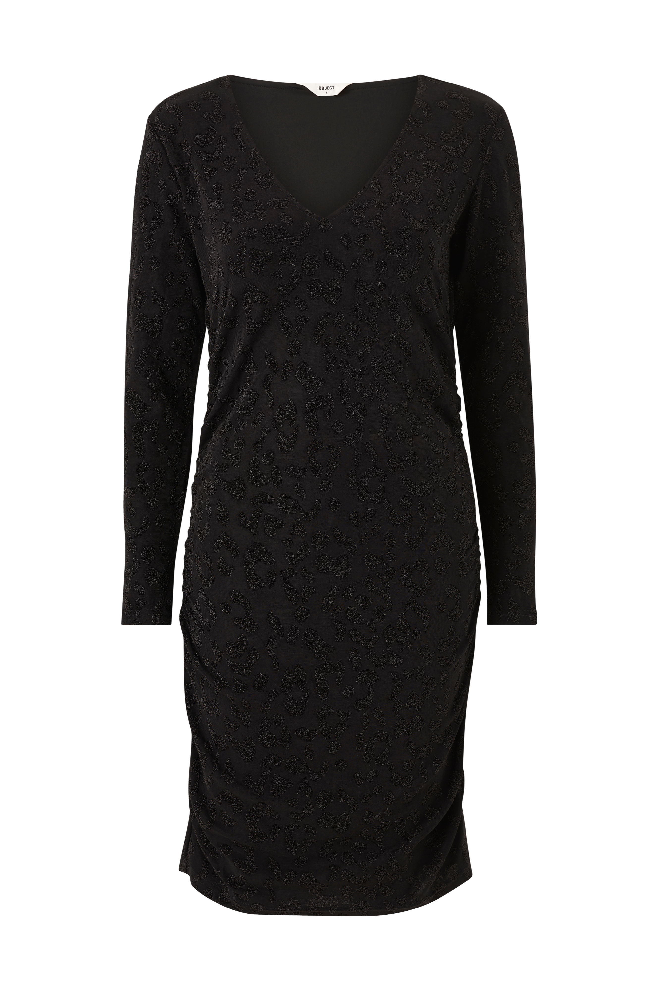 • Figursyet kjole med skinnende mønster• V-udskæring• Drapering i siderne• Trikotfor• Længde: 95 cm i størrelse S