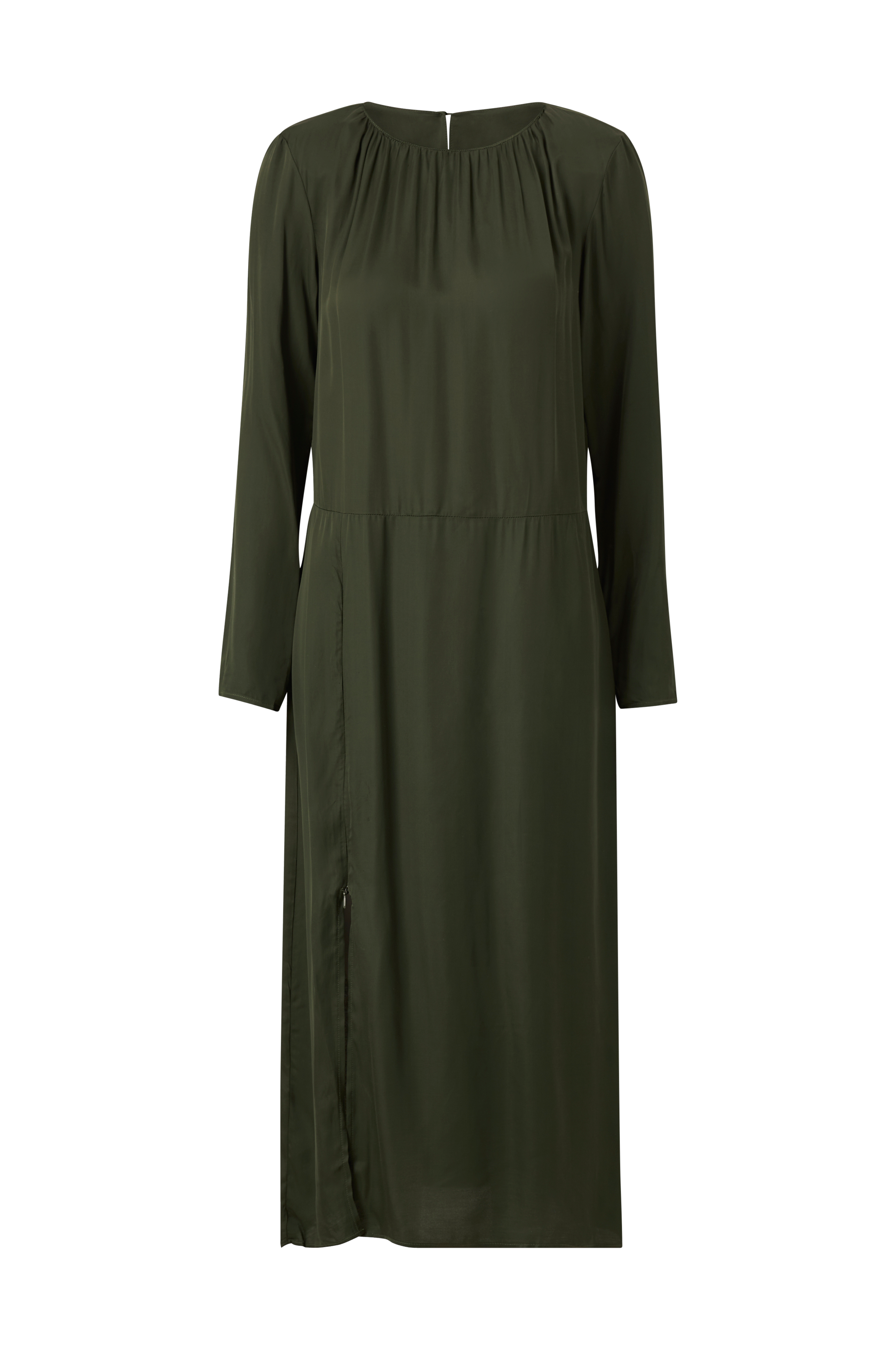 • Kvalitet med glans• Rynket halsudskæring• Ventilation med knap i nakken• Høj slids med lynlås foran• Skulderpuder• Længde: 128 cm i størrelse 36