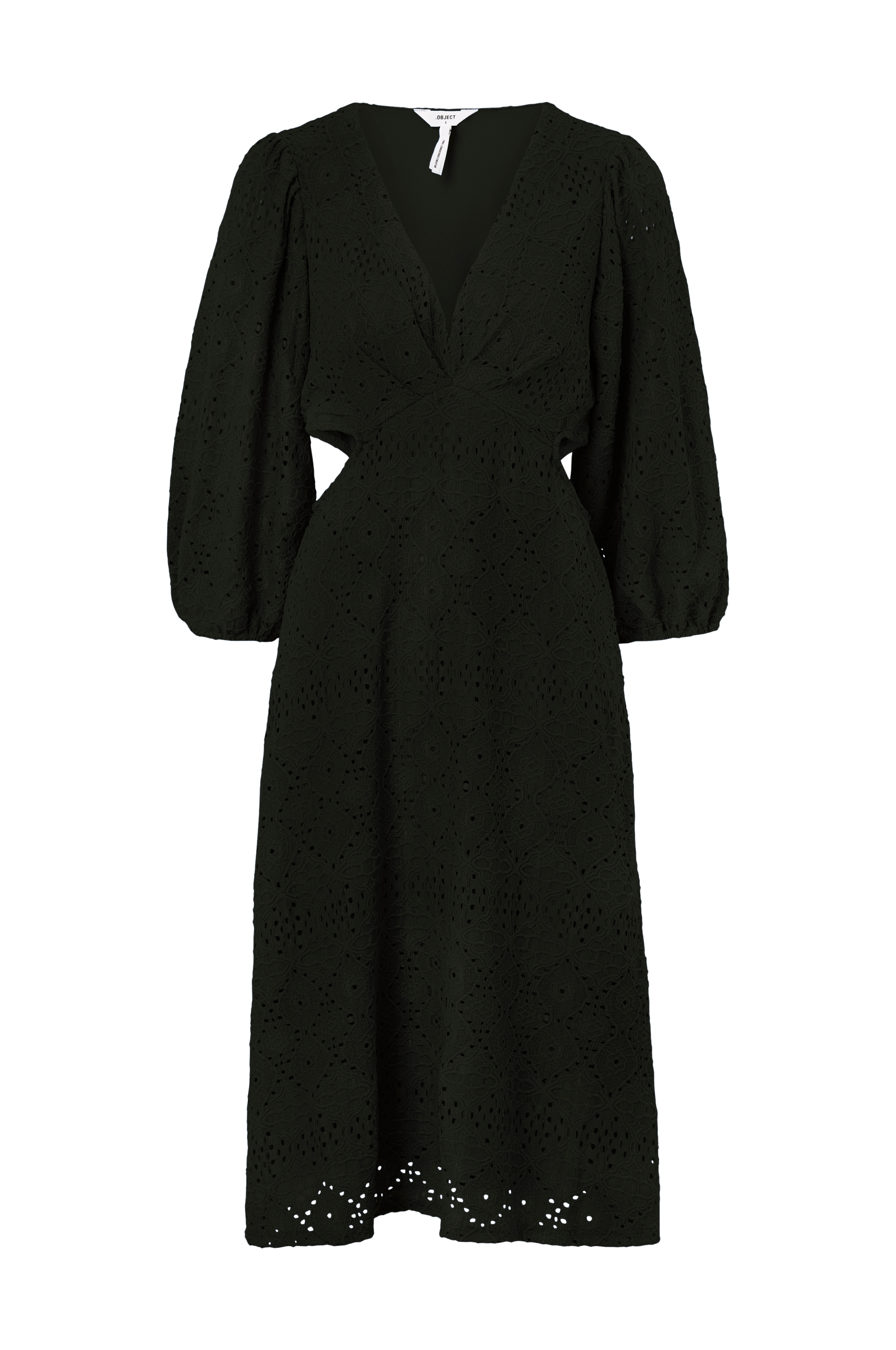 • 3/4 lange ballonærmer • V-udskæring • Lægge ved brystet • Åbninger ved taljen • Materiale med hulmønster • Trikotfor • Længde: 105 cm i størrelse S • Produktet indeholder genindvundet materiale, som genbruges for at reducere mængden af affald samtidigt med at der ikke anvendes nye ressourcer.